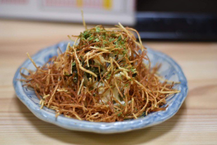千切りされたじゃがいもを揚げたサクサクフライドポテトが乗ったポテトサラダ。酒場の定番商品にしっかりと開発力を、注いでいらっしゃる。