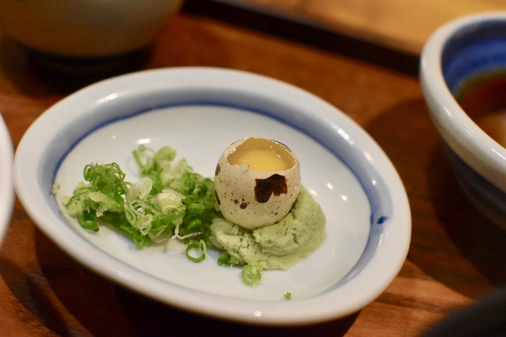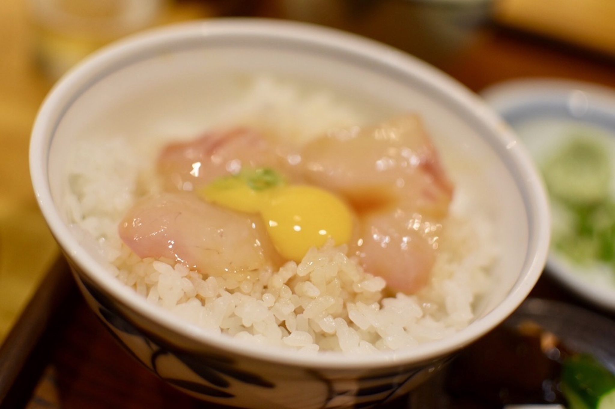 ウズラの卵を乗せていただきます。ほかほかのご飯の上でほんのりと温まったプリプリの鯛の身にほど良く卵とタレがからみます。