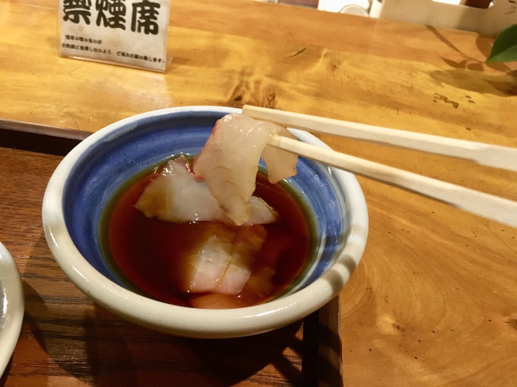 お邪魔したのは日曜日、開店直後の17:30。すでに予約でいっぱいとのこと。しかしここで「「鯛めし」だけ食べたいのですが」、とお願いし、30分くらいしか滞在しないことを告げて、19時から予約がいっぱいだそうで、その前になんとか入れてもらいました。