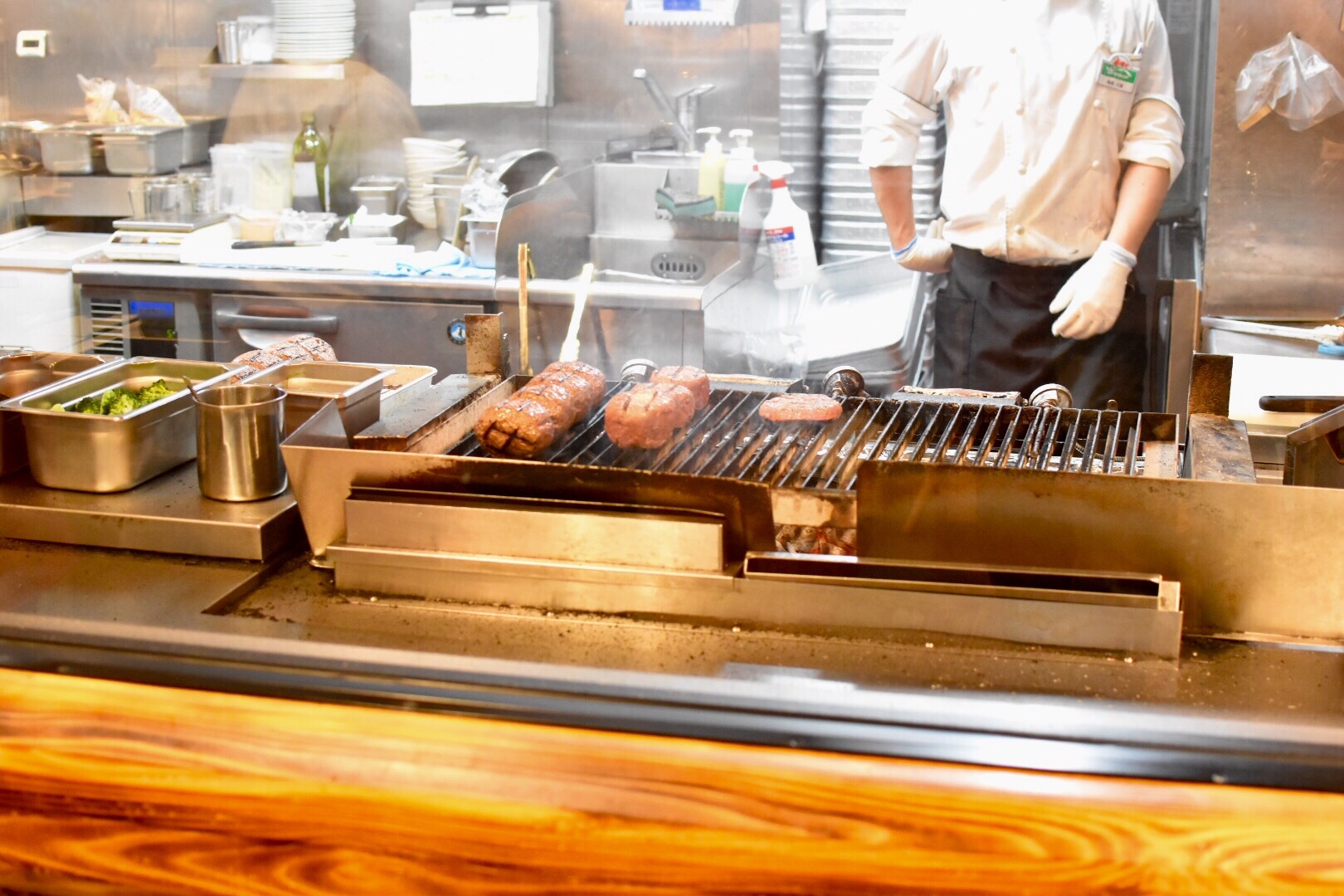 入り口からほど近くに炭焼チャコール。素晴らしいのは厨房の清潔感。ピカピカです。