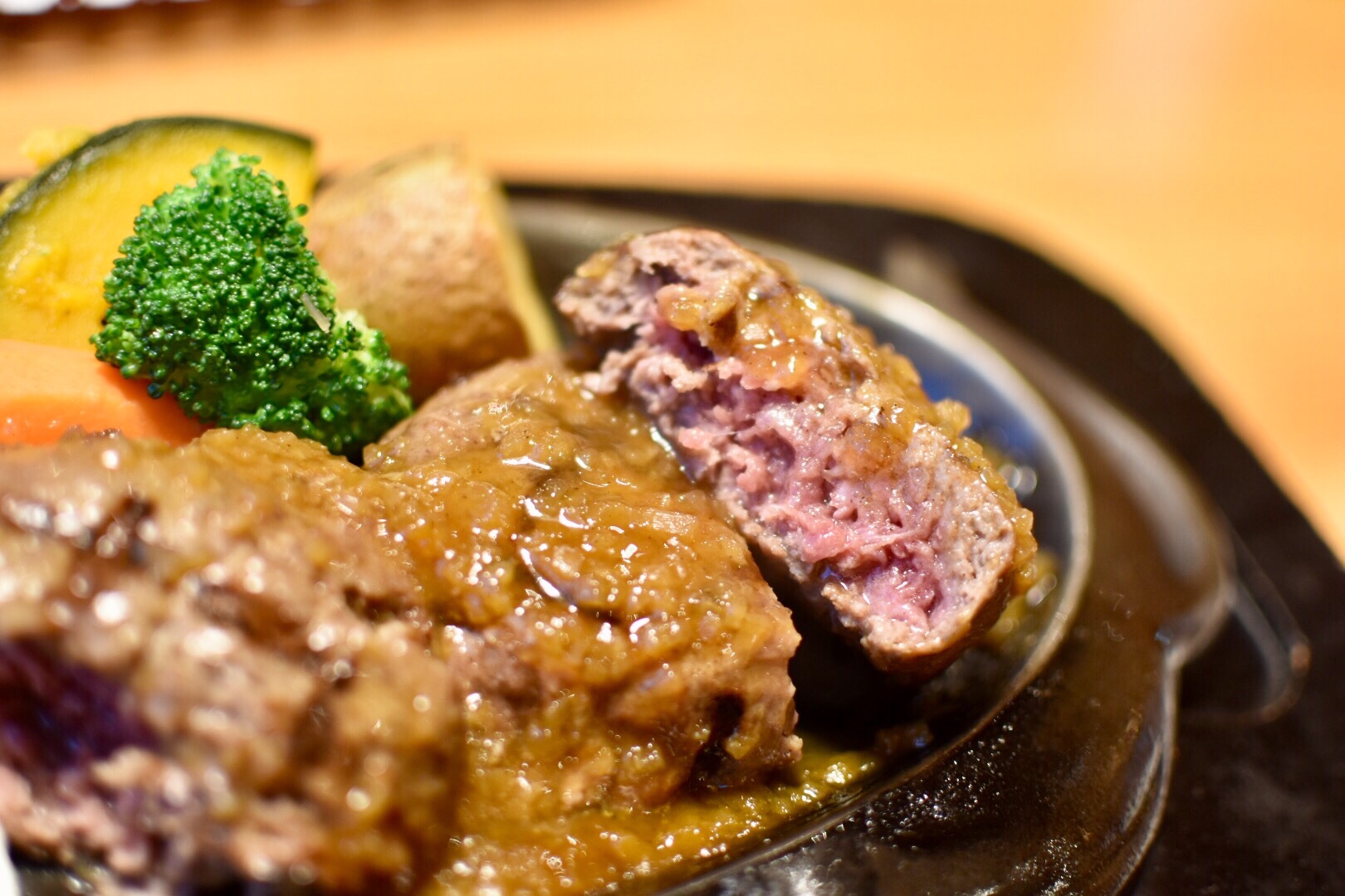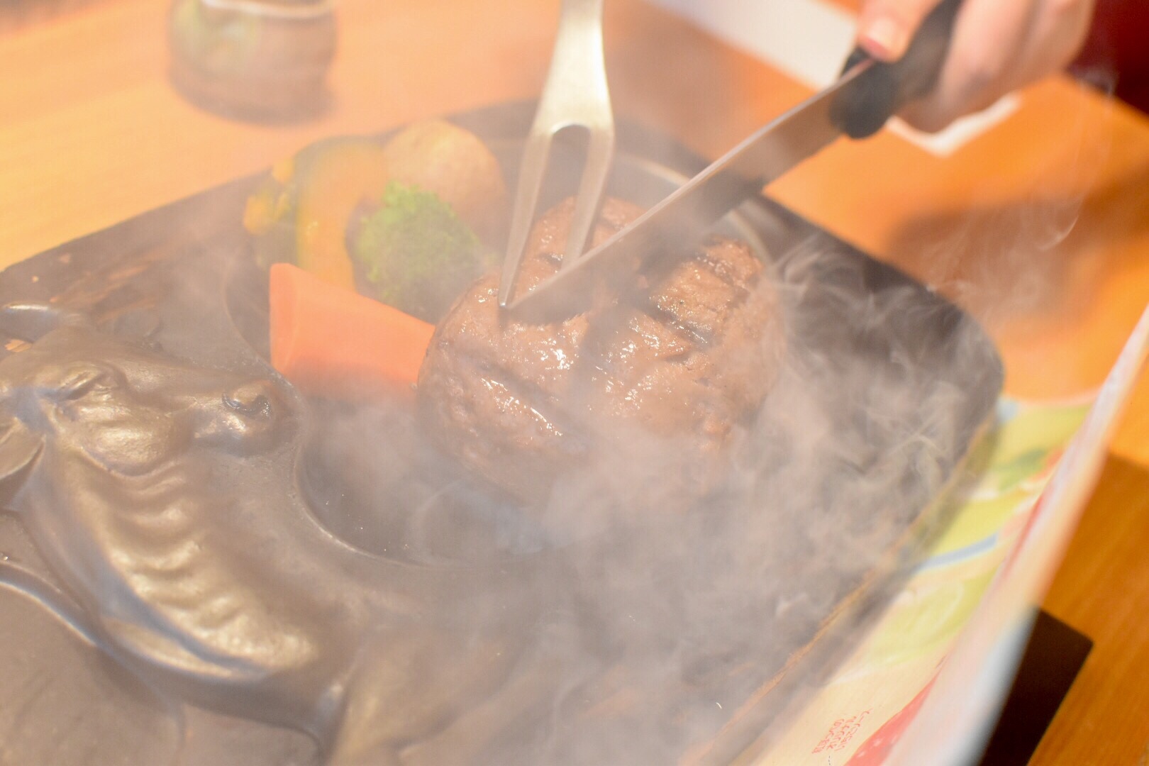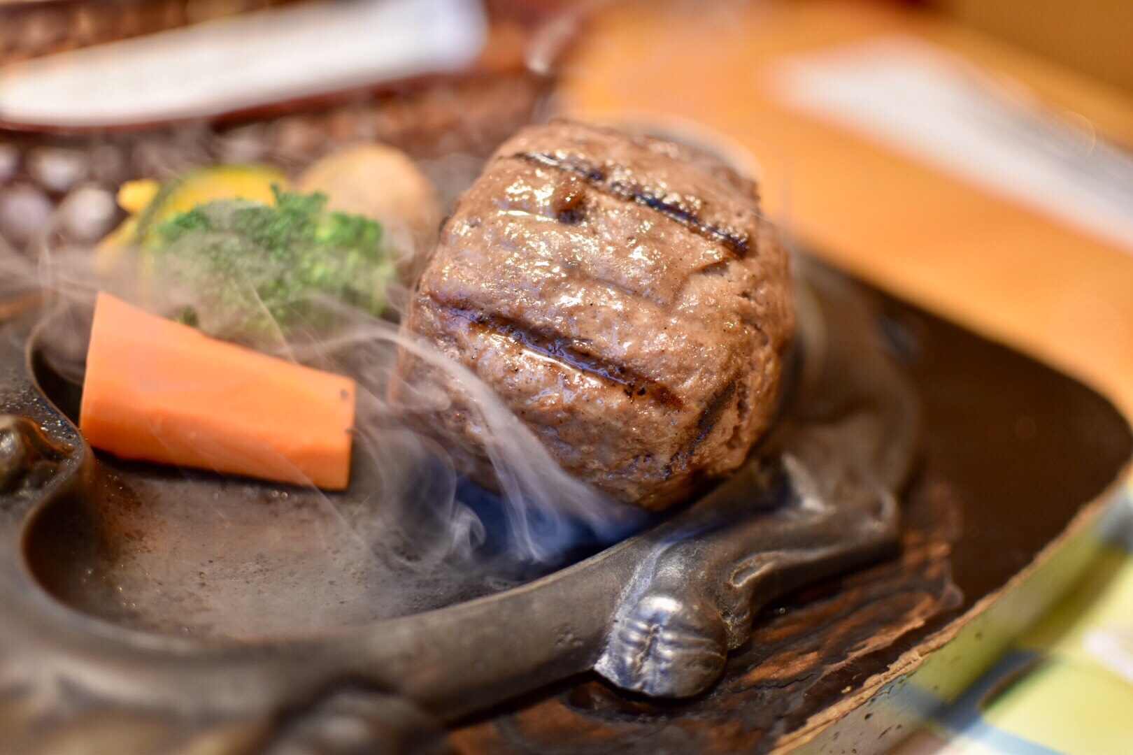 その断面は鉄板で焼かれるのです。鉄板の上で、バチバチと弾け踊る肉汁。