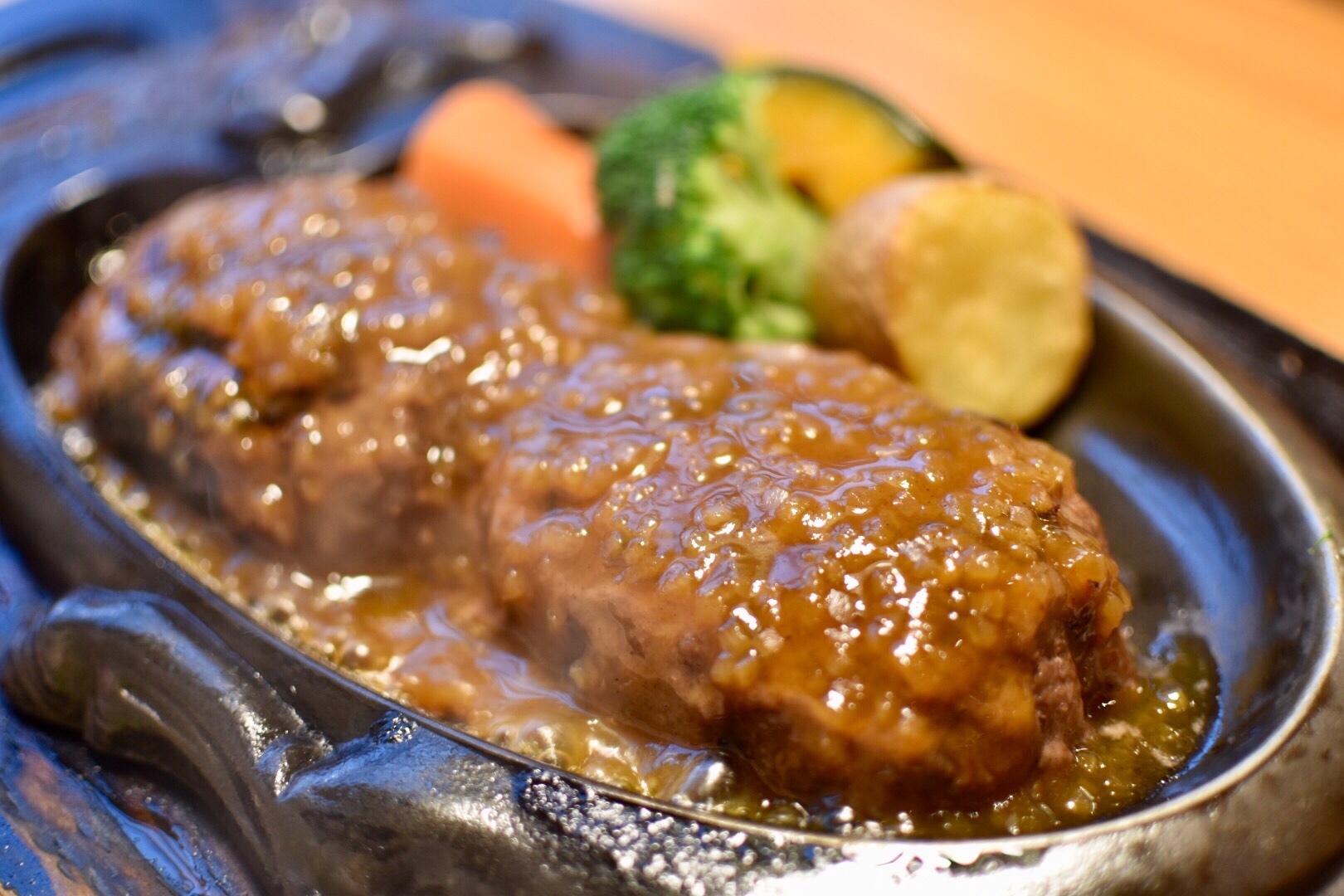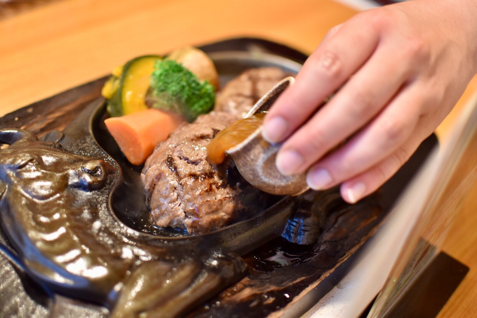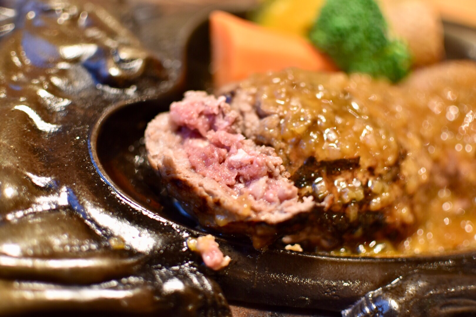 その断面は鉄板で焼かれるのです。鉄板の上で、バチバチと弾け踊る肉汁。