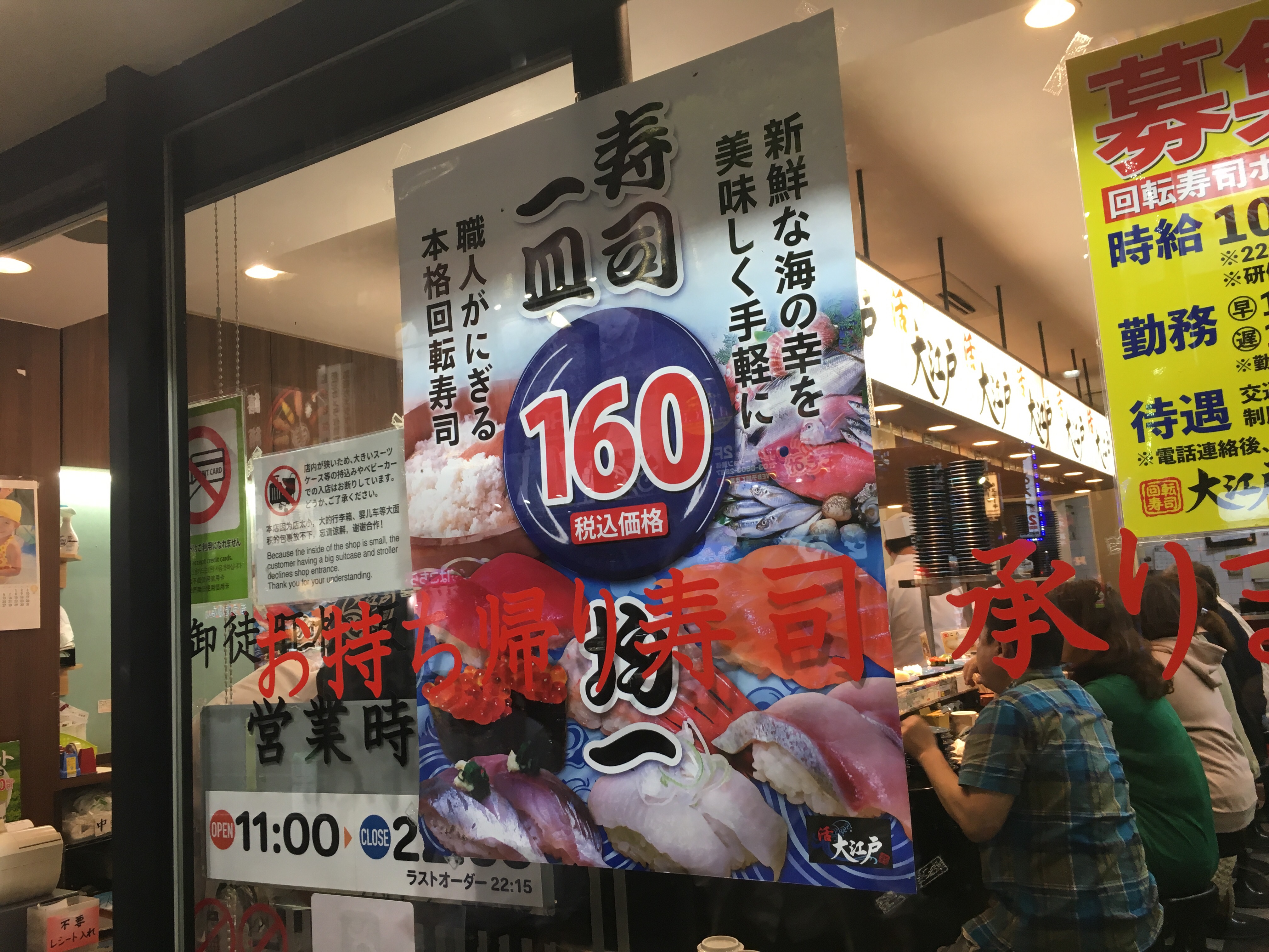 上野・御徒町エリアには回転寿司が多いですね。外国人にとってこのあたりは観光のメインでもあるでしょうから。外国のお客様も見受けられます。お店側も英語の掲示物は欠かせません。