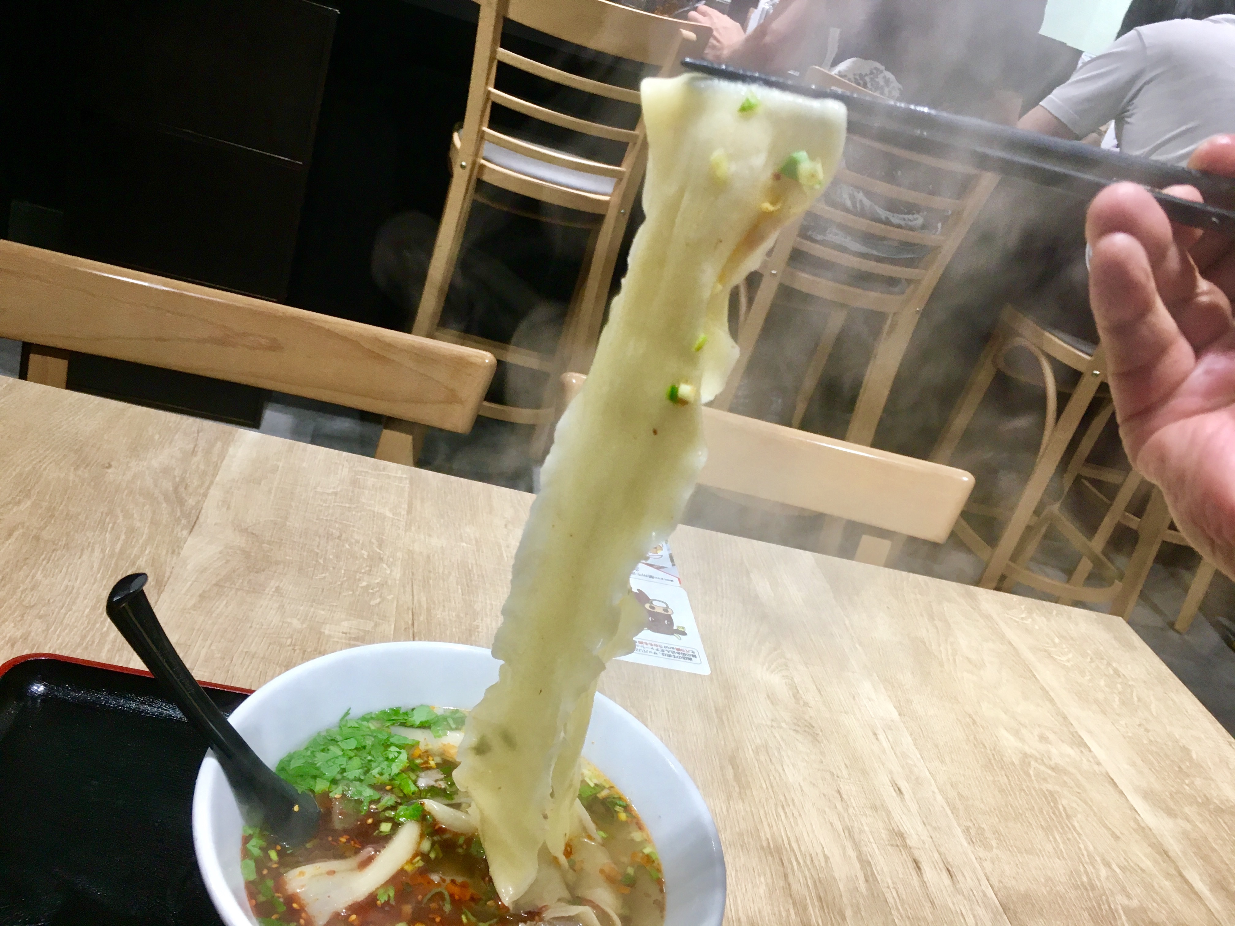 「蘭州牛肉麺」というのは、中国・西北部の甘粛省蘭州 (かんしゅくしょうらんしゅう) 発祥の食べ物だそうだ。牛骨と薬膳スパイスのスープに手打ち麺が特徴。