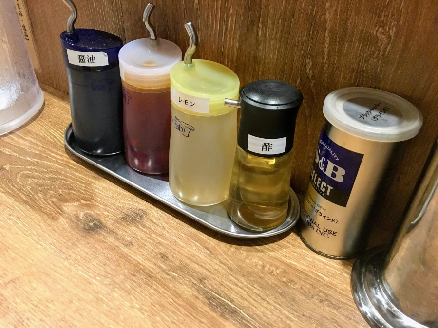 卓上の調味料には、ブラックペッパー、醤油、ラー油、レモン果汁、酢。