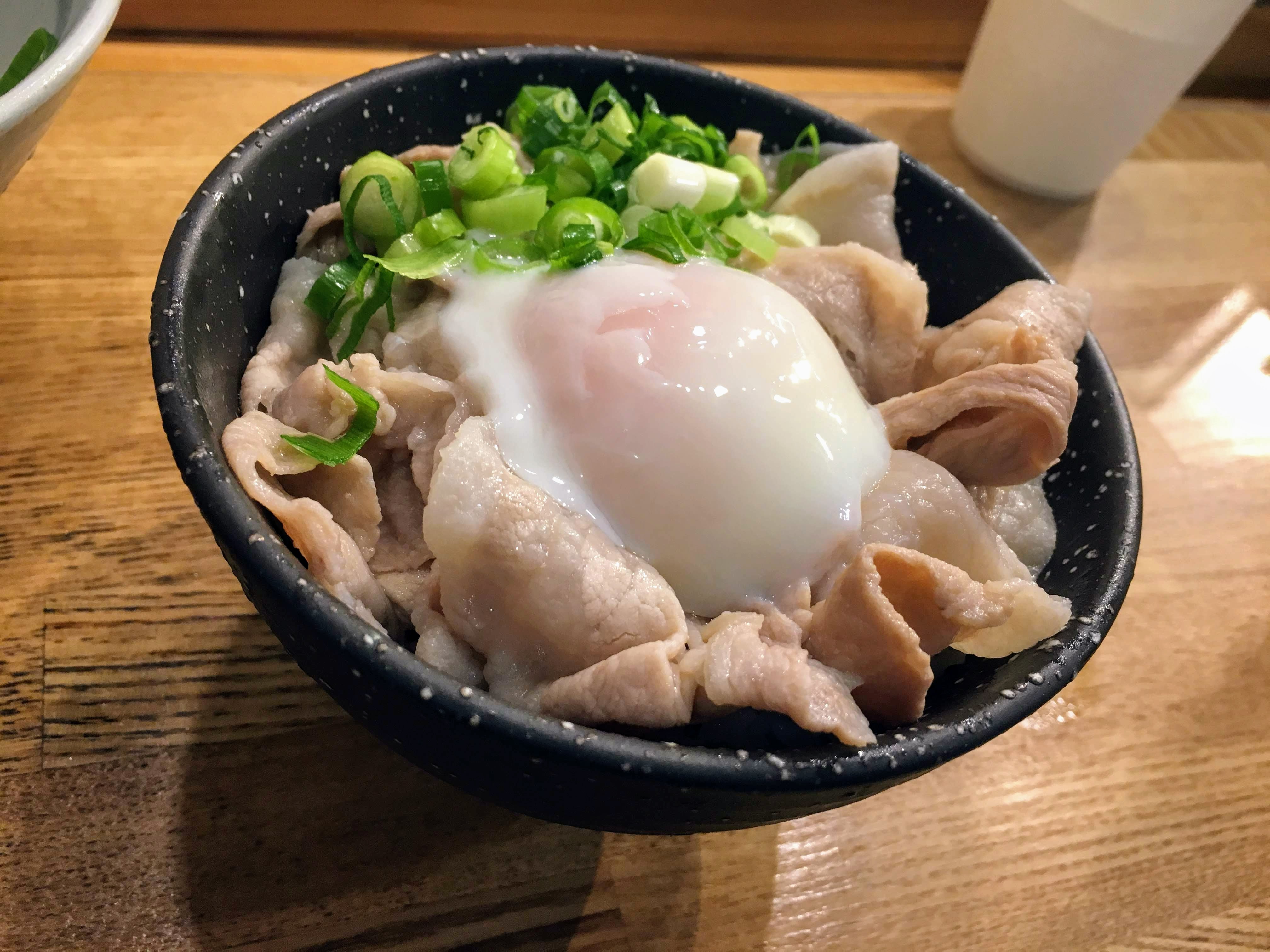 お茶碗いっぱいに盛られたこちらは、うどんと同じく林SPF豚肉とさらに温泉卵が乗る。出汁醤油を垂らして頂きます。230円でこのクオリティは、うどんのみならず驚くばかりである。