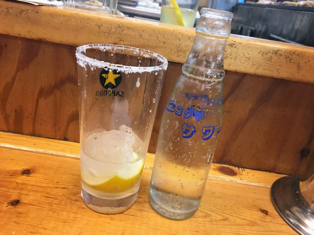 コダマサワーの瓶に注がれた炭酸。縁に塩のついたサワーグラスにはシャリキン。