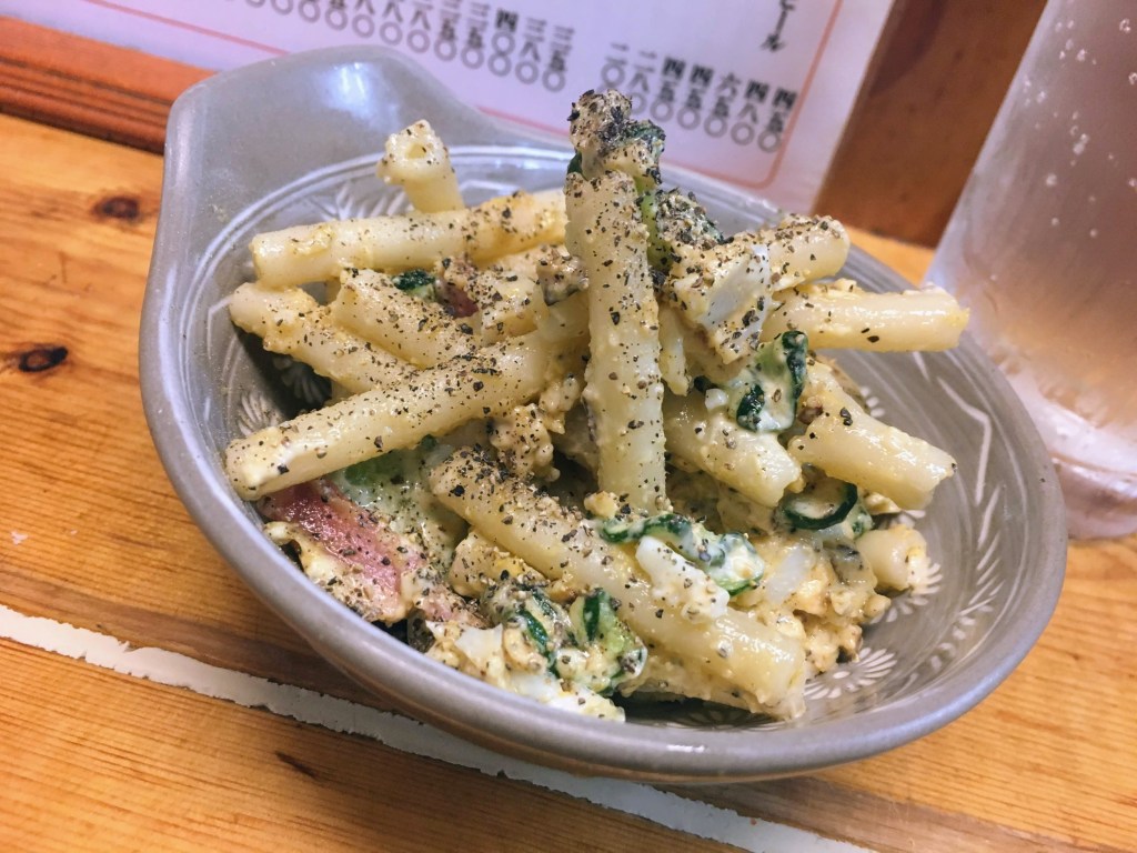 お酒に合う塩加減と濃厚な味わい。ネットリな感じにスモークチーズのコクとピリリと黒胡椒のアクセント。どストライクのマカロニサラダ。