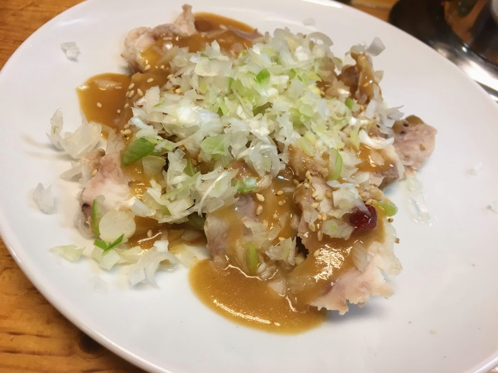 選んだのはアブラ刺し。刺しと言ってもボイルしたもの。コレに酢味噌がかかっています。食べ物を食べ物で例えるのはどうかと思いますが、豚足の様な味わい。思いの外さっぱりと頂けてパクパクいけちゃいます。