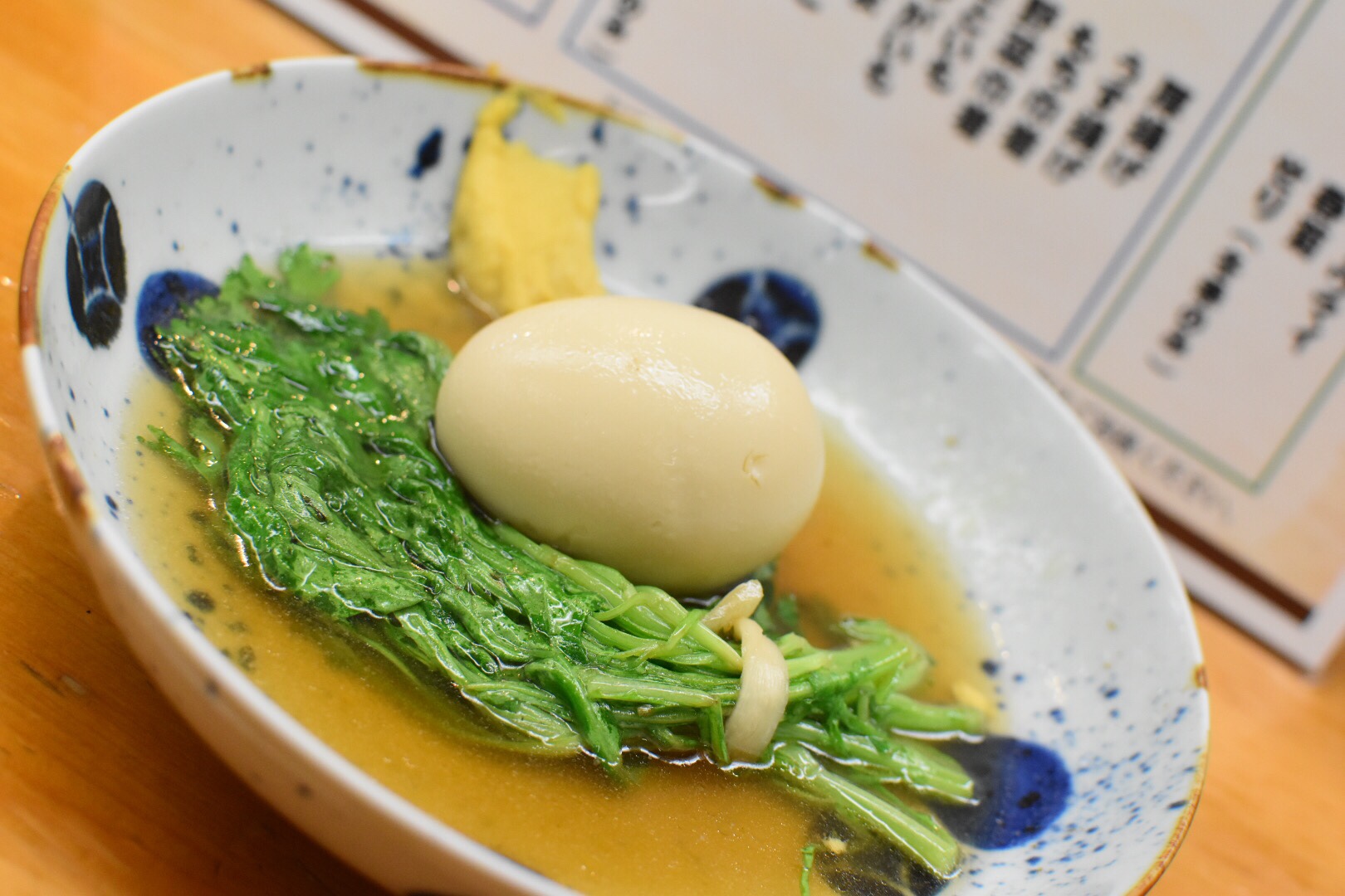松江おでんの真骨頂は葉物。冬以外は春菊。オーダーが入ってからおでん鍋でしゃぶしゃぶ。