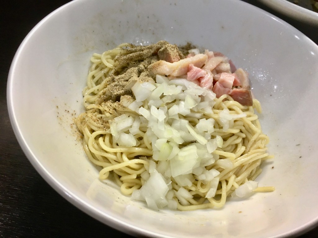 和え玉はoily。煮干しオイルに煮干しパウダーが絡み、食べやすくて、よく混ぜてからそのまま&頂き、更に濃密なスープにつけてつけ麺風に。