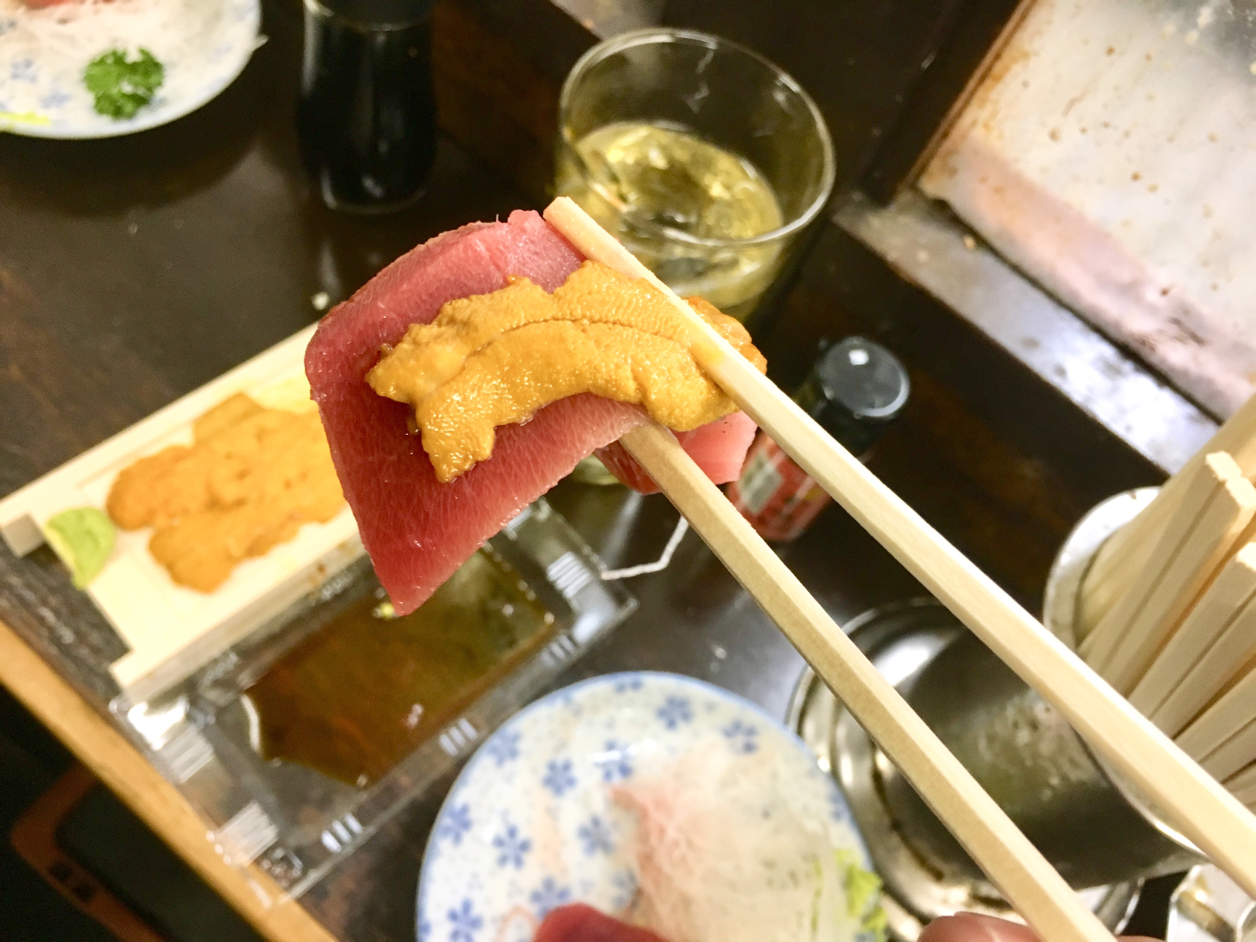 まずカウンター中央で飲み物と、料理を注文。(おそらく9割はマグロブツとウニと言うでしょう。)