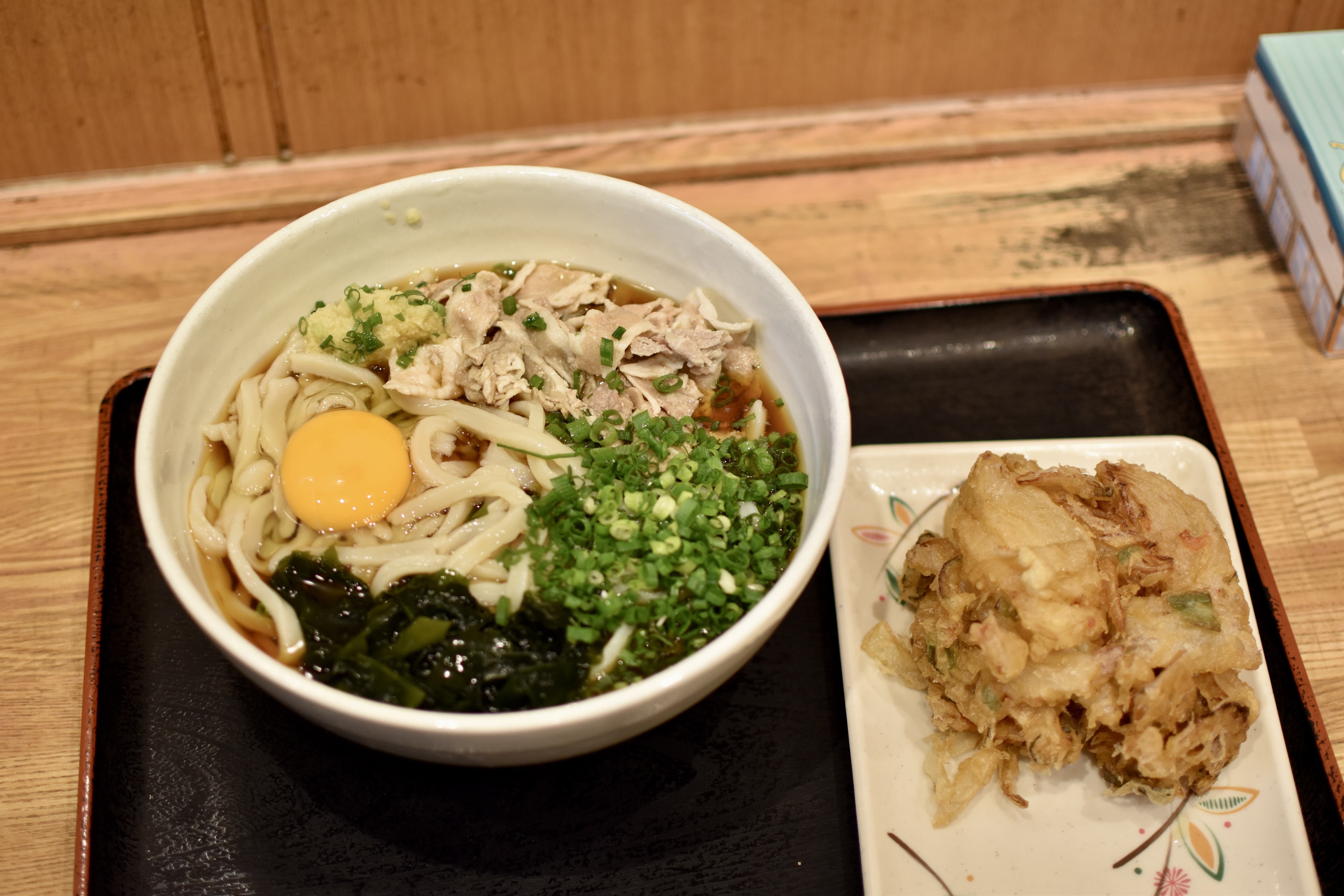 トレイを持ってカウンターで注文を告げ、商品を受け取り、席に座るというセルフ方式のうどん屋さんです。