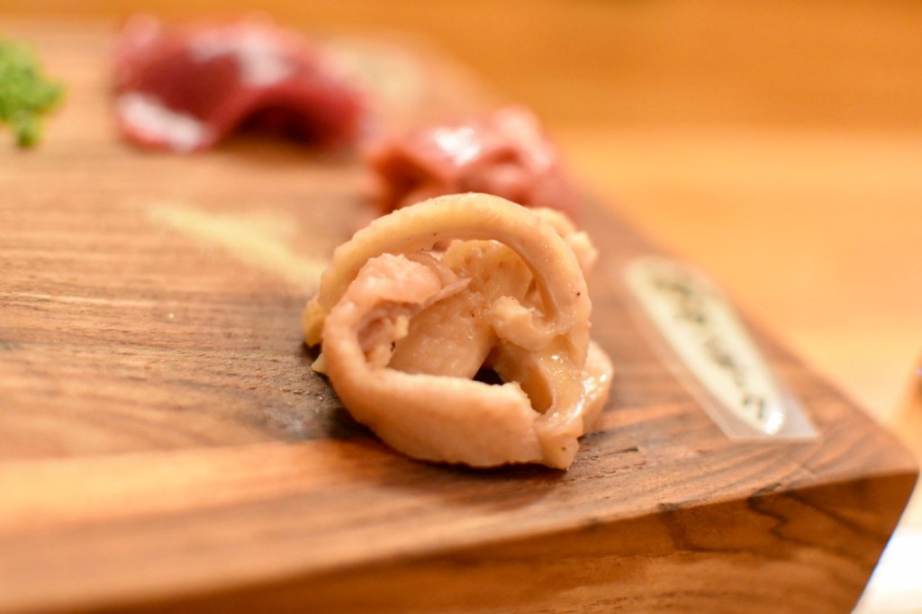 食道・気道の部分です。軟骨とはちょっと違うコリコリとした弾力のある食感が特徴ですね。クセはなくて食べやすい。