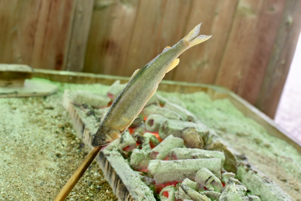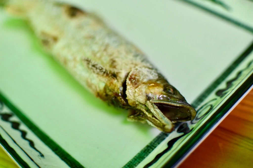 天然あゆ。高級食材ですね〜。魚の大きさがわからなかったのですが、コレで中位の大きさだそうです。