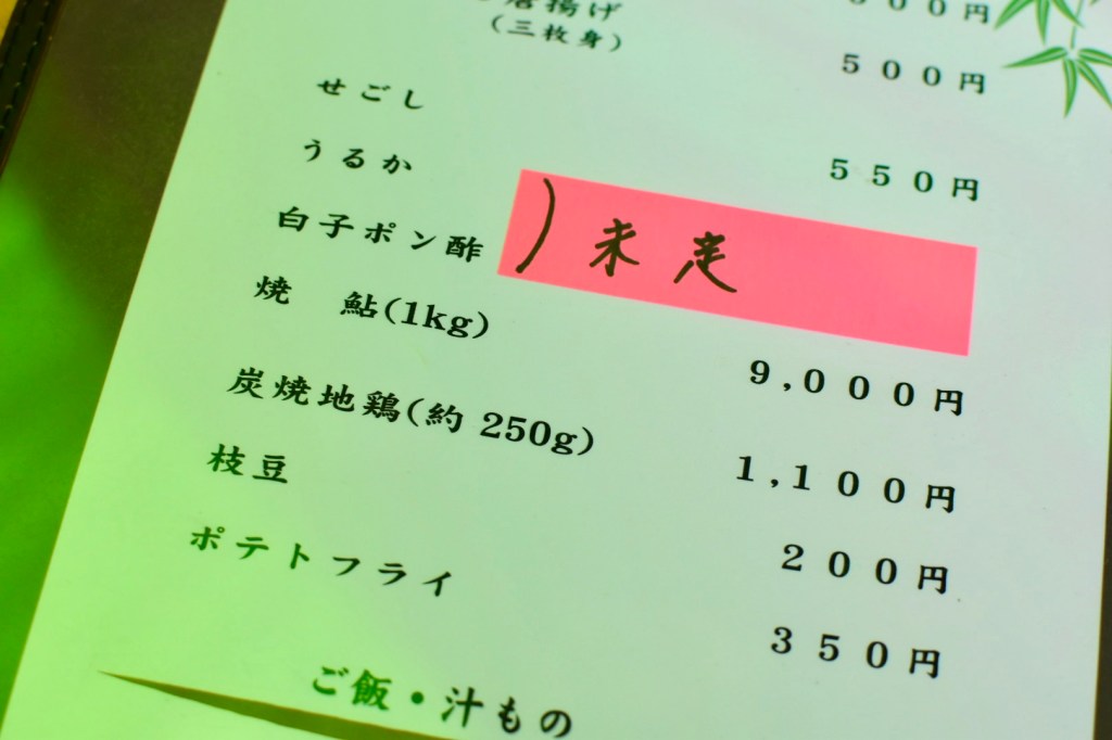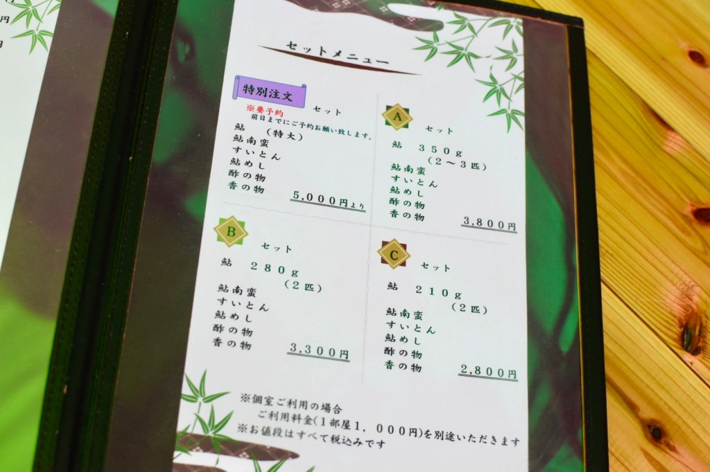 焼鮎(1kg )9,000円というのがお品書きに記載されています。