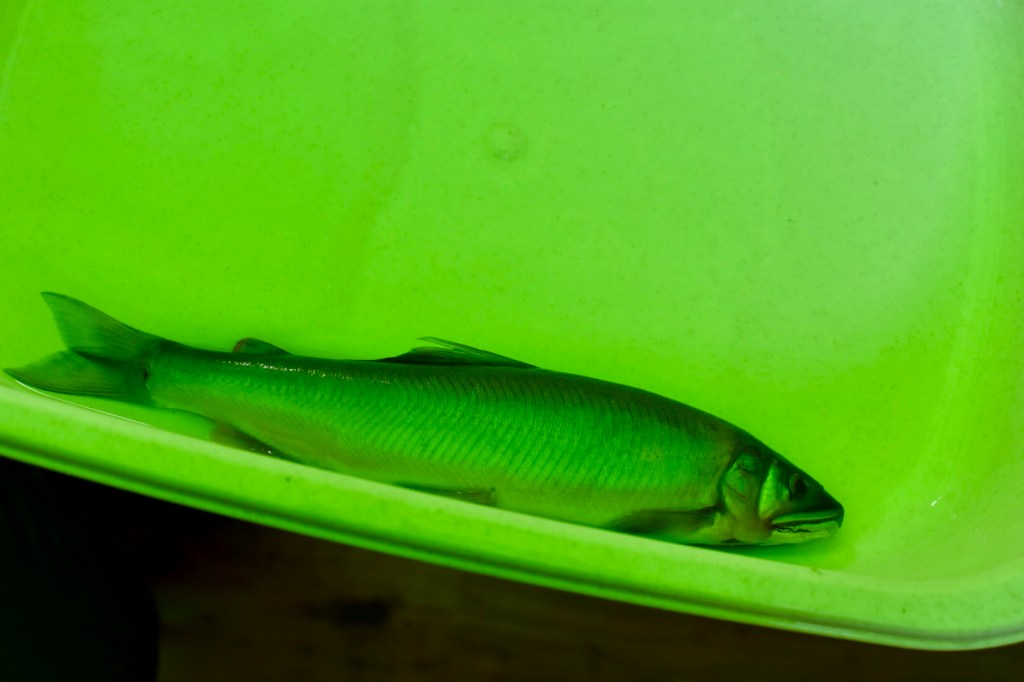 孵化した稚魚は、海に下ってプランクトンを食べ、春に再び上流部を目指し川を上がってきます。
