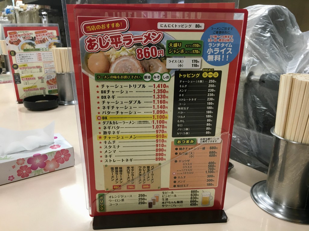 営業時間は11:00~1:00までと、特に飲んだ後の〆として使われることが多いようですね。(水戸駅周辺にはホント、ラーメン屋さんが少ないです。)