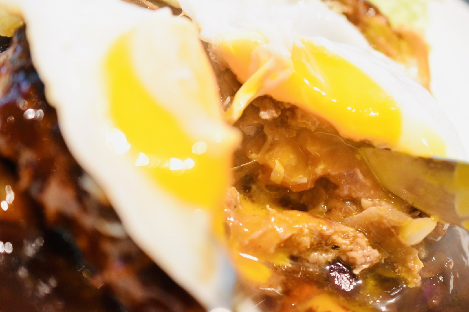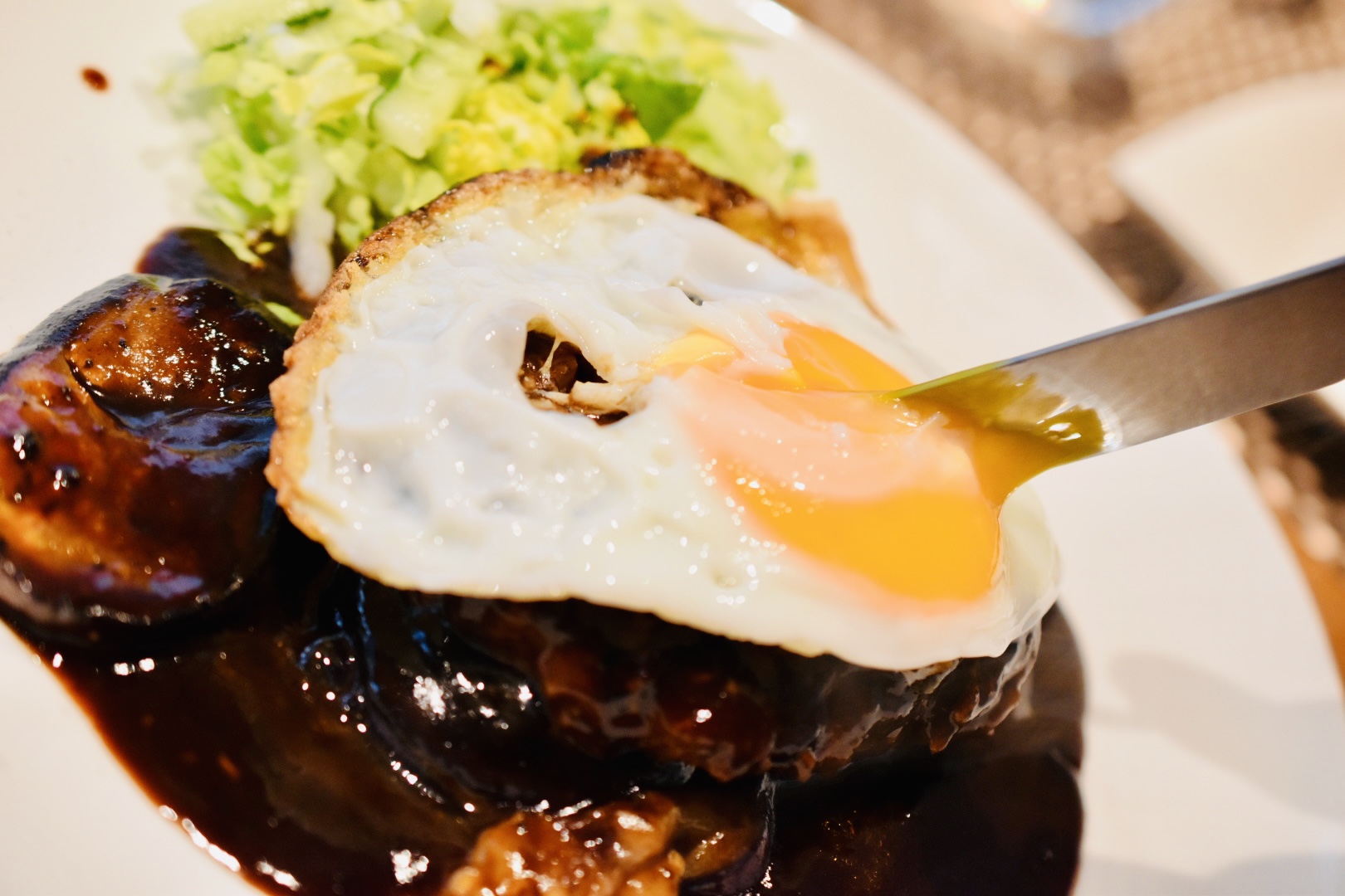 口の中に、卵とデミグラスソースを纏ったフワッフワなハンバーグの食感から溢れ出す、旨味‼︎ ソースの中に潜むナスもトロットロ。ハンバーグのフワフワとナスのトロットロが合わさり、至福以外の何者でもない。