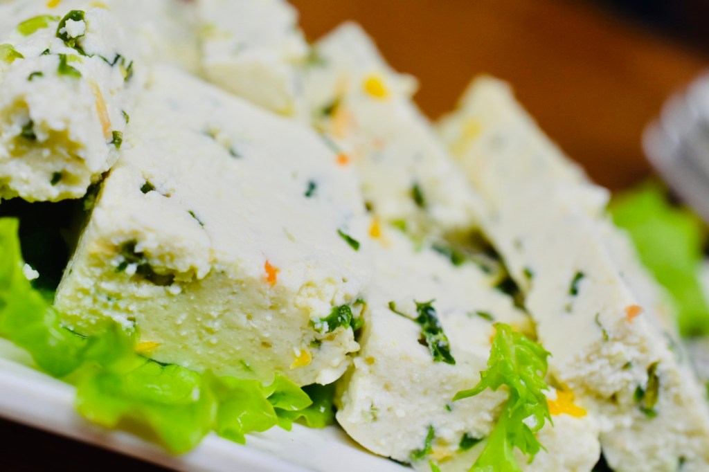 「菜豆腐」(宮崎県・椎葉村の郷土料理)。豆乳に刻んだ野菜などを入れて固めた豆腐。