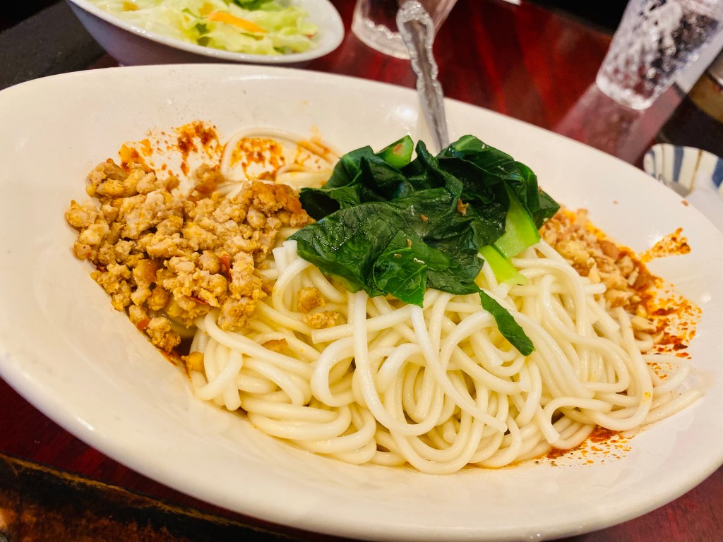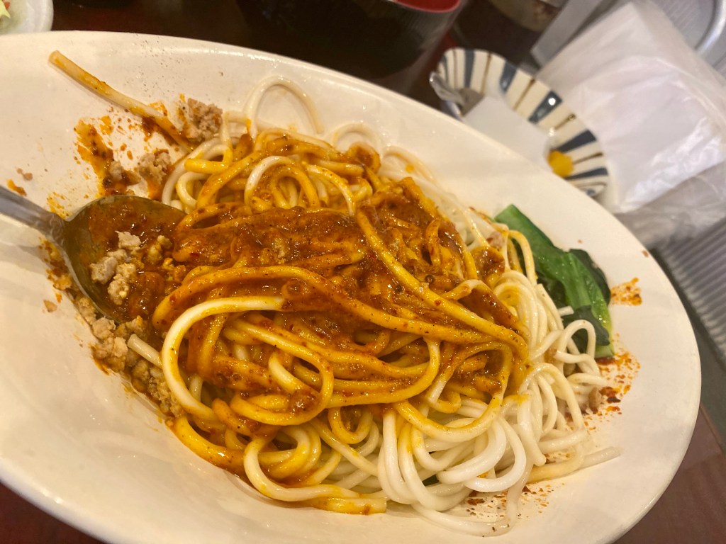 お目当てはこちらの「汁なし担々麺」。口頭で注文。辛さも選べるようだったが「普通」でお願いしました。(相当辛いとの前情報でしたので…)