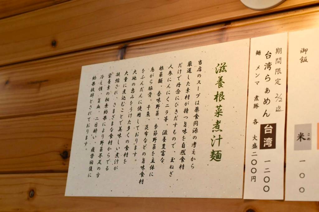 “当店のスープは滋養同源の考えから厳選した素材が持つ旨みを自然食材だけで丹念に引き出すもので、玉ねぎ人参にんにくニラ等、滋養方湯女根菜類、香味野菜、季節野菜を主体に鶏がらとんこつ、干魚、昆布なのどの旨み食材をふんだんに使用しております。