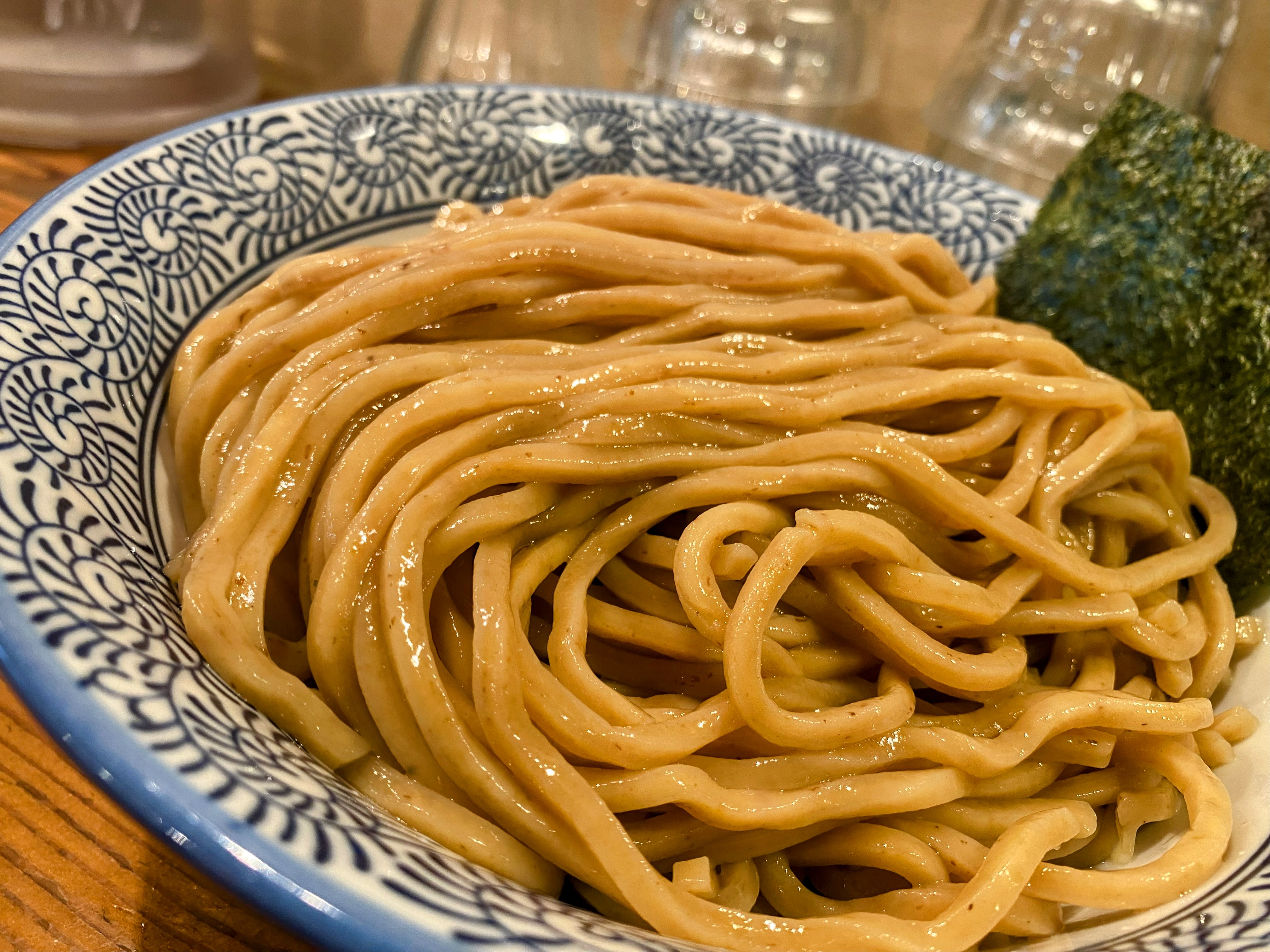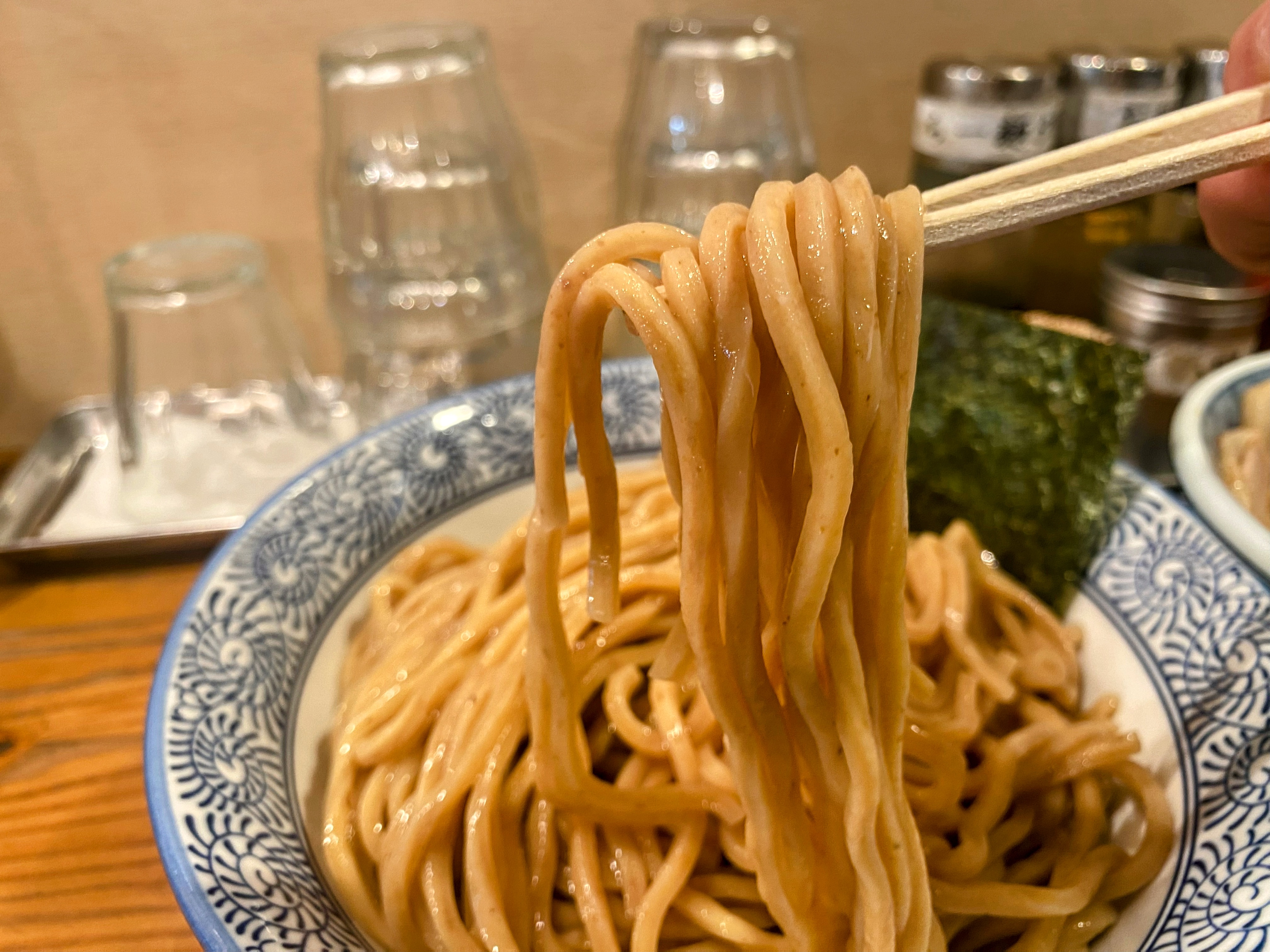重厚感のある麺に負けない濃厚なスープ。麺にしっかり絡む。柚子の皮が爽やかさを演出。