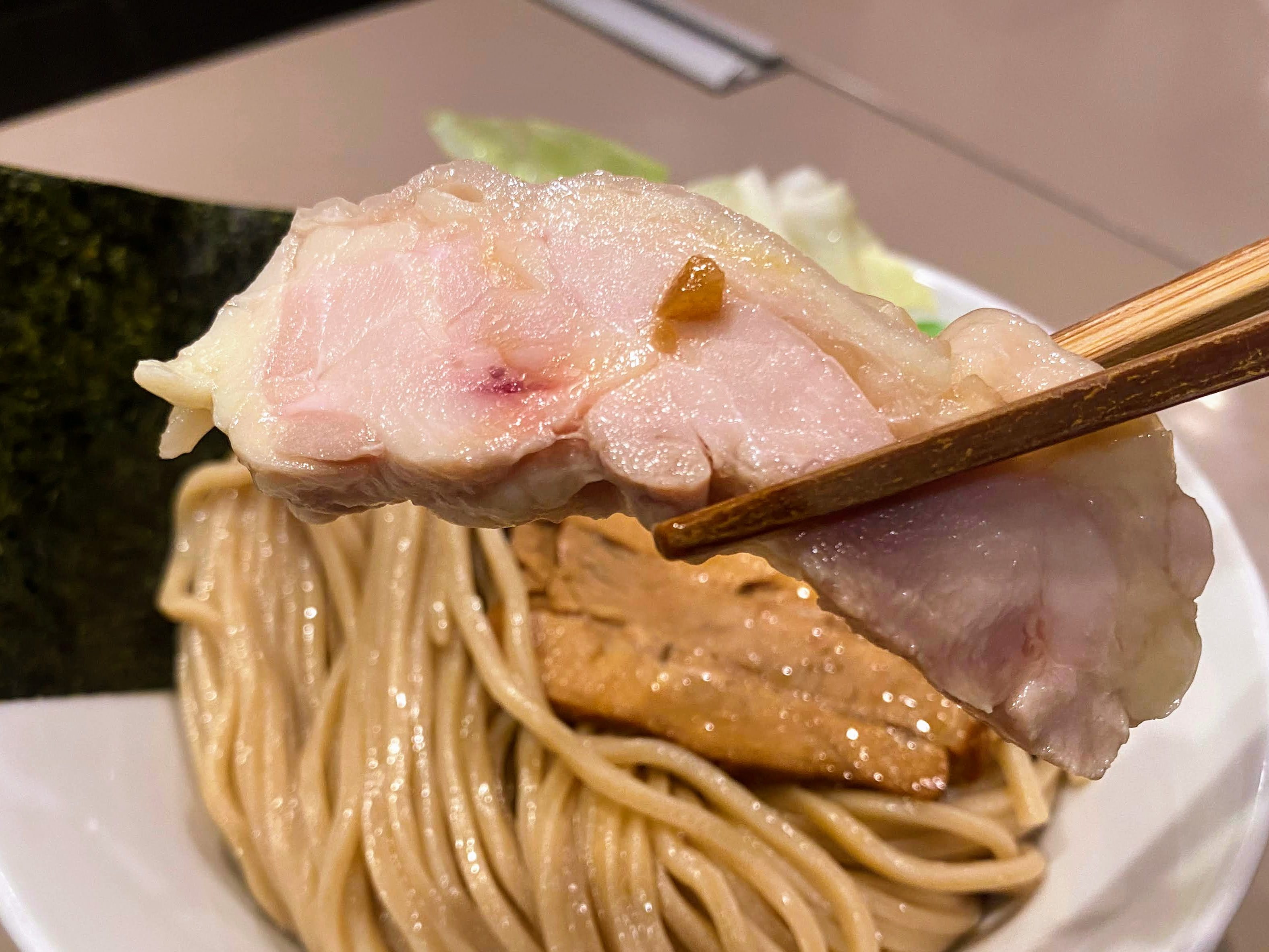 1つは鶏のチャーシュー。低温調理されたしっとりジュシーな味わい。