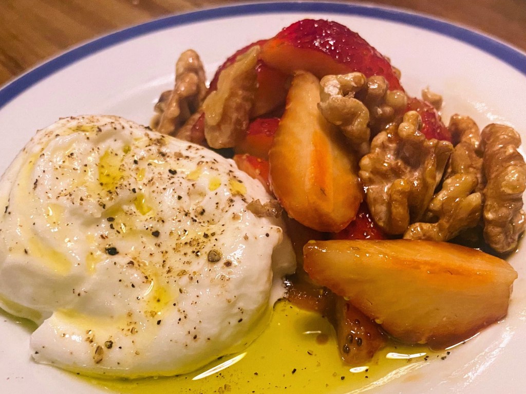 モツァレラチーズはシンプルにオリーブオイルと胡椒で。いちごと胡桃の方はバルサミコで味付け。