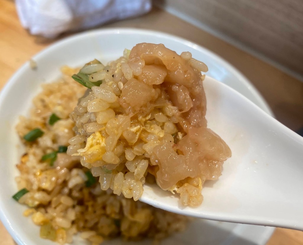 ラーメンよりも少し先に提供されていたので、それをパクパクと食べていたら、チャーハンの背脂とラーメンの背脂のダブルパンチ。