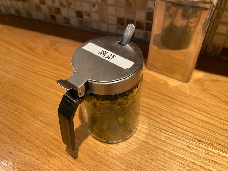 やや早めにスープから引き上げた排骨を乗せて卓上の辣油をひとまわし。