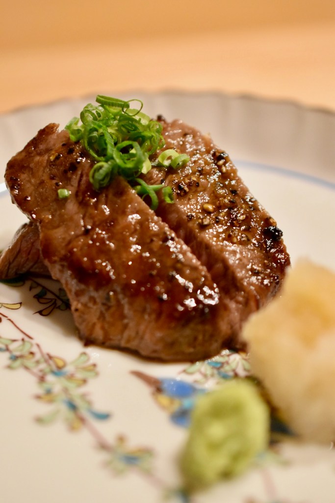 しっかり目に焼かれた宮崎牛。赤身の部分。サシよりもこのような余分な脂がない方が宮崎牛の良さを感じることができる。