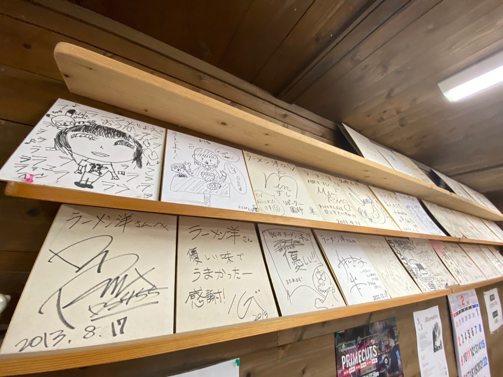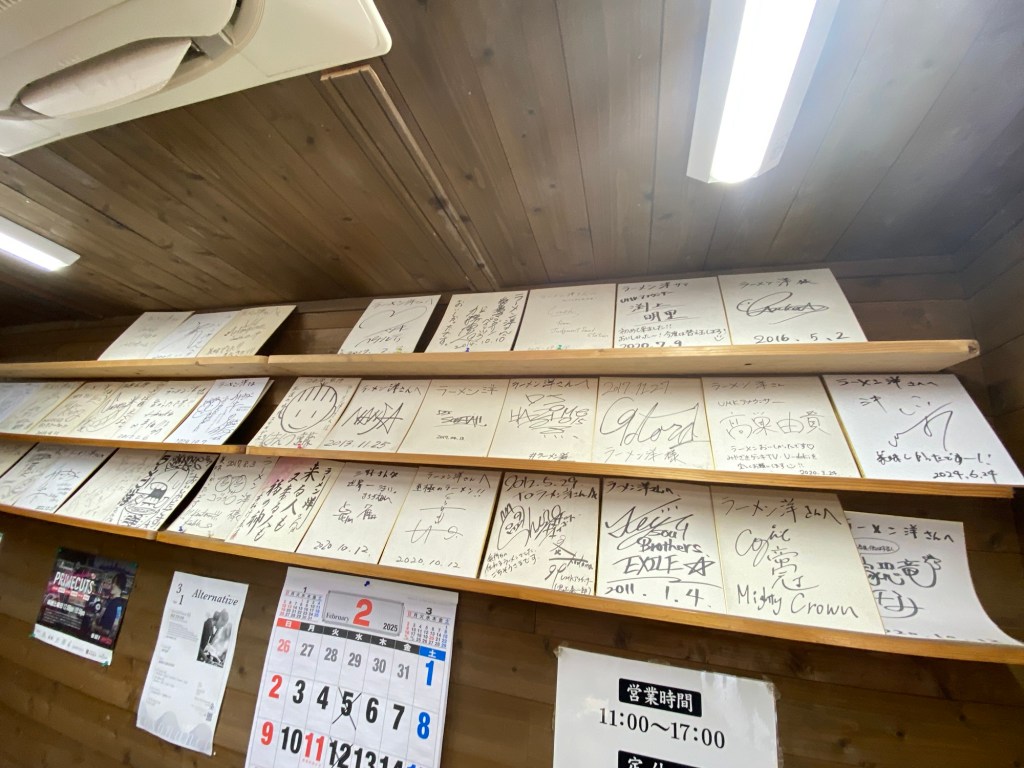 店内: 壁には多くのサイン色紙が飾られており、人気店であることが伺える。