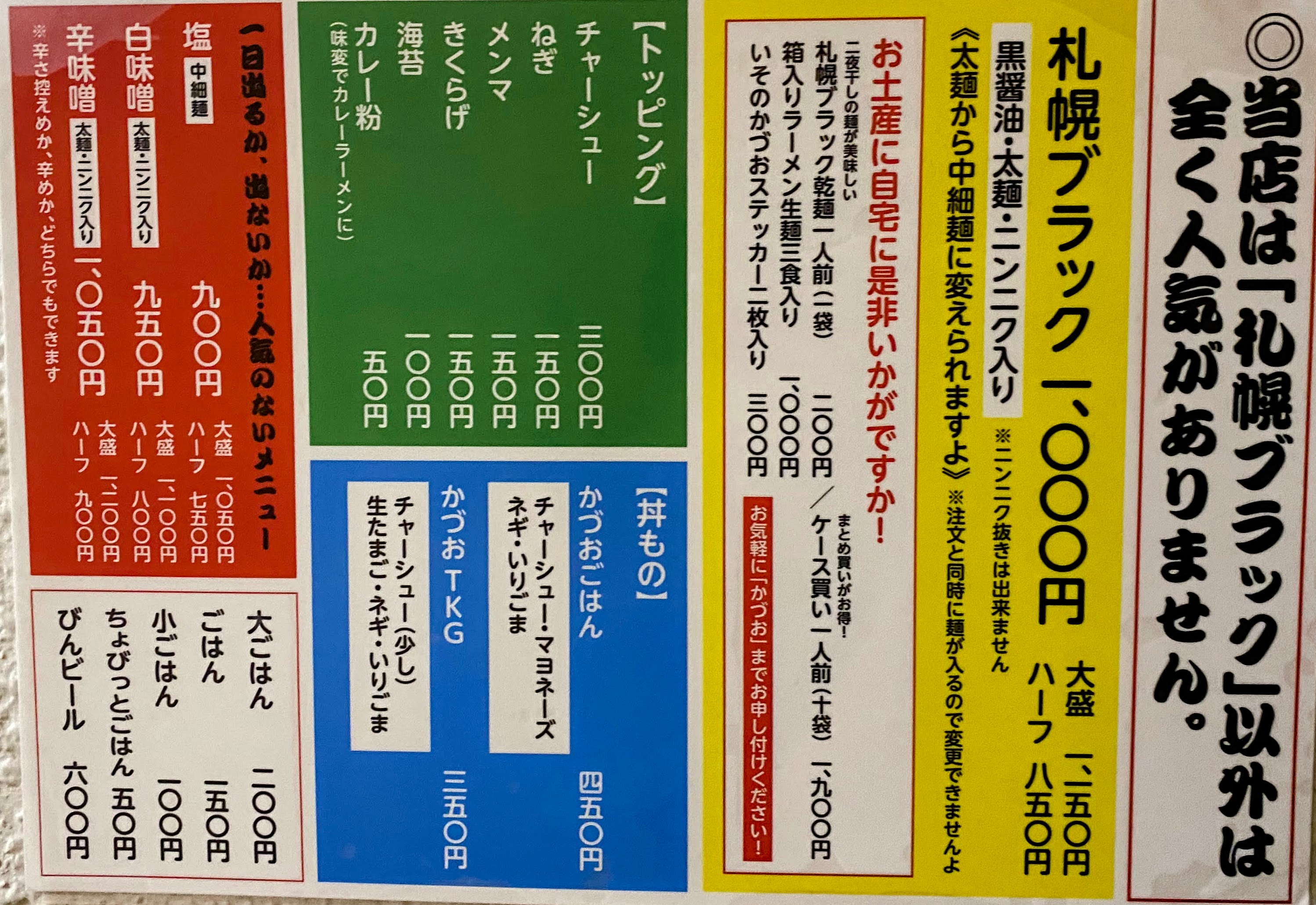 - その他のメニュー: 「札幌ブラック」(1,000円)、黒醤油油太麺・ニンニク入り(1,100円)などがある。トッピングとしてチャーシュー、メンマ、きくらげ、海苔、カレー粉など。ご飯ものも充実しており、かづおごはんやチャーシューマヨネーズ丼などがある。