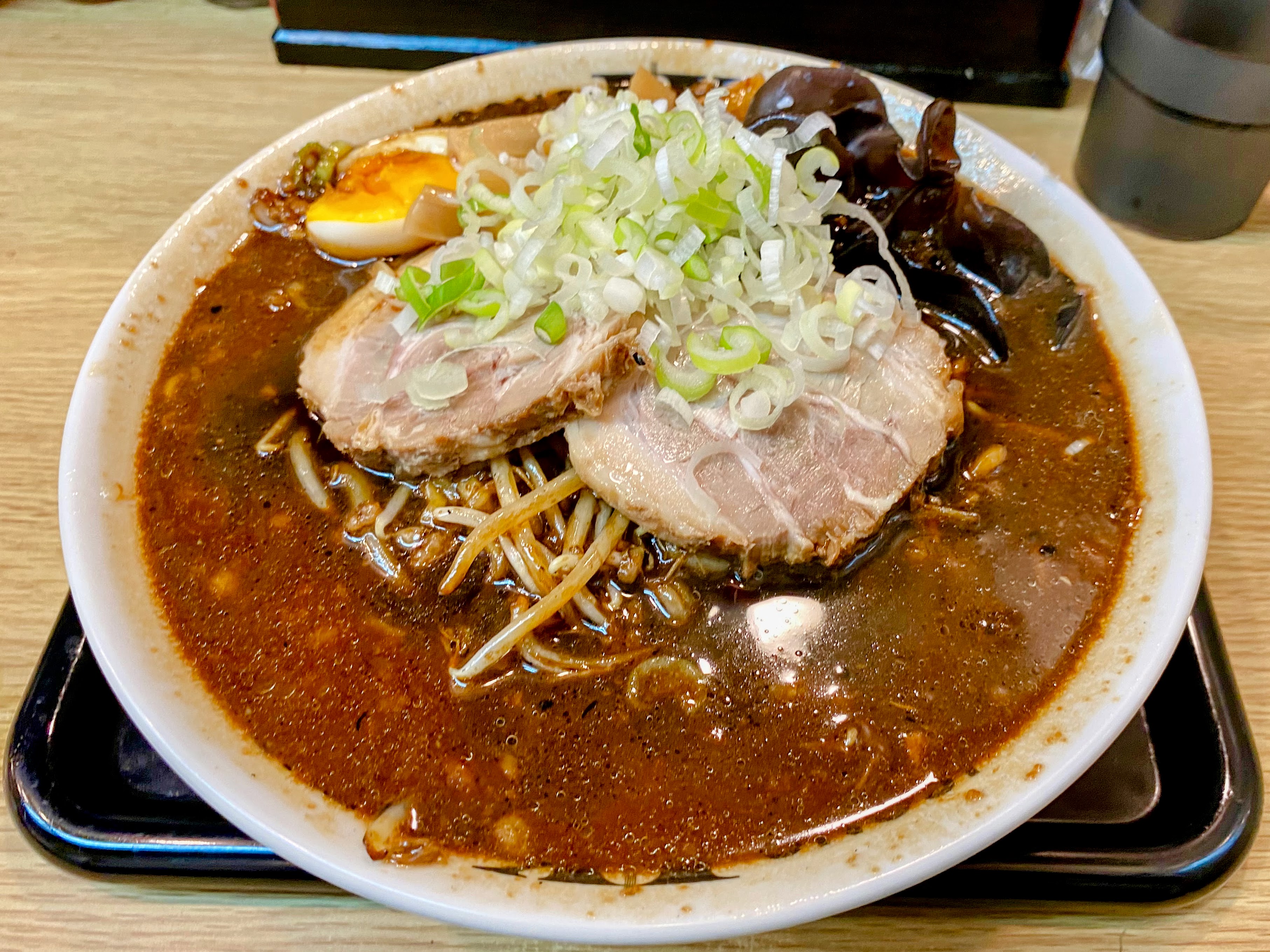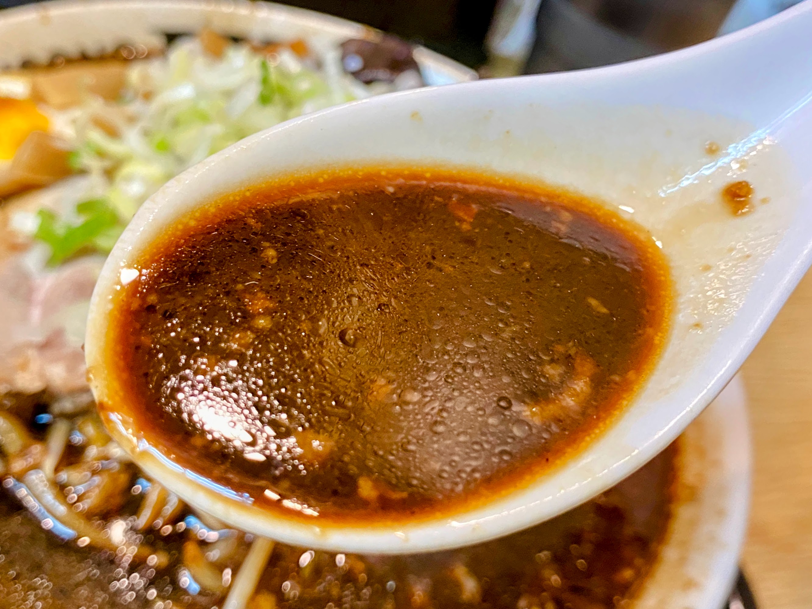 たまり醤油とマー油をベースに、玉ねぎの甘みとにんにくの風味が絶妙に調和した一杯。見た目の濃さに反して塩辛さは控えめで、飲んだ後の〆としてもぴったりの味わいだ。