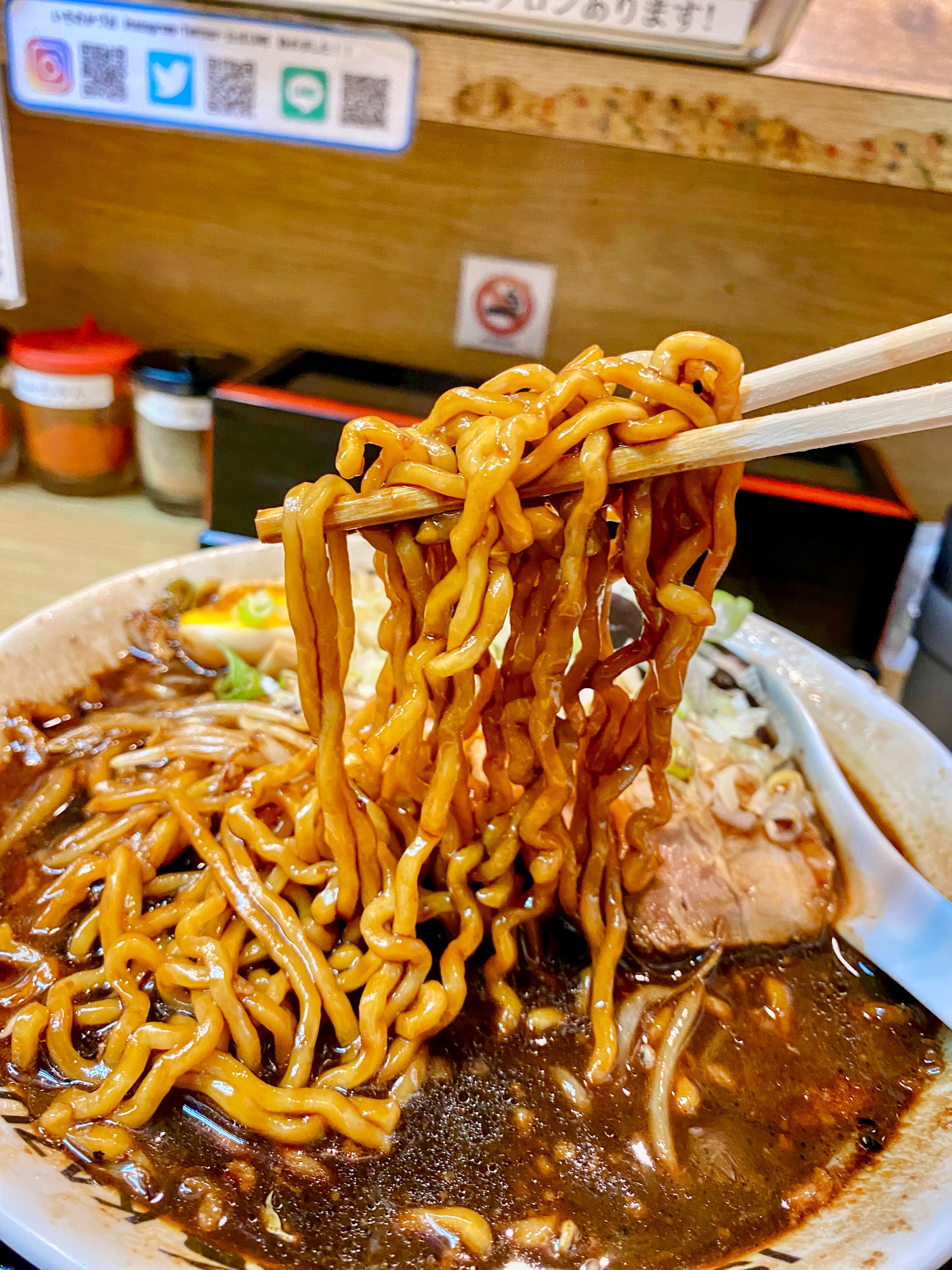 硬めの縮れ麺で、濃いスープによく合う太麺。このスープにはこれでなくてはならないという相性。