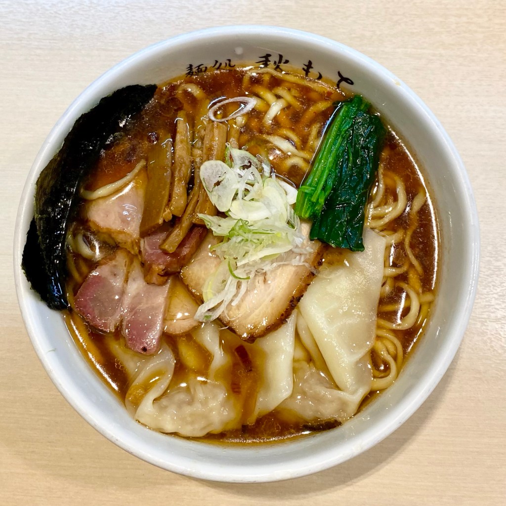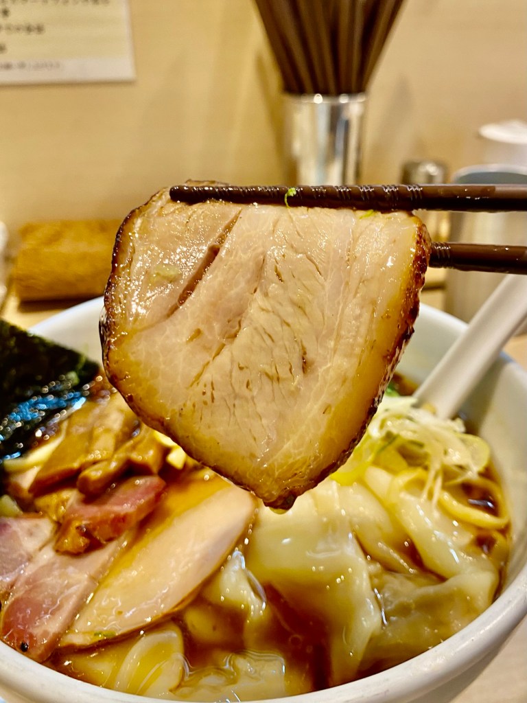 海苔、ねぎ、ほうれん草、メンマにわんたん2つ、チャーシューが3種類。