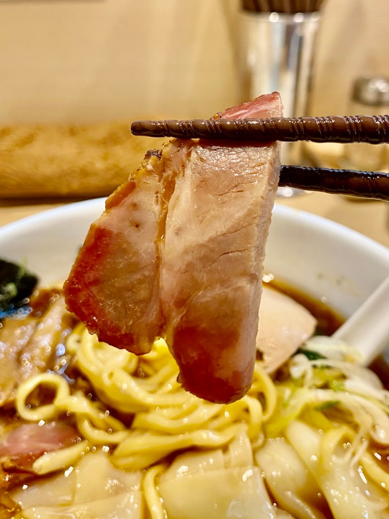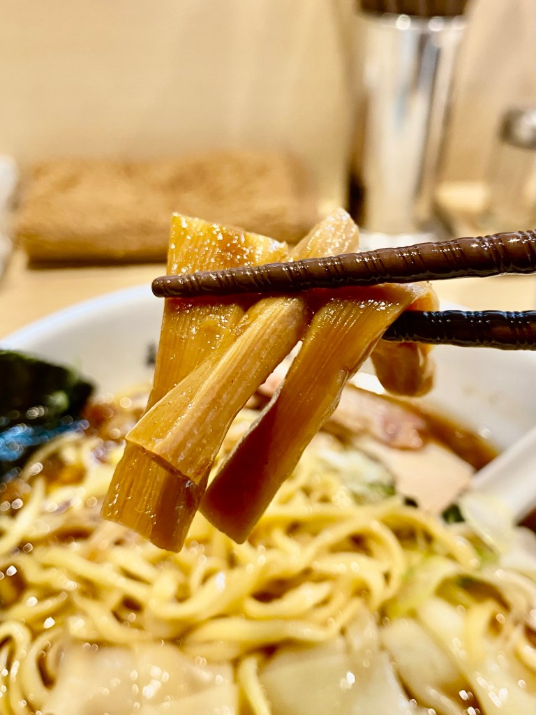 鰹出汁の力強さ・鶏のコク。キレというより深みのある醤油。そしてスープが熱々。浮かぶ香味油がしっかり表面を覆っている。