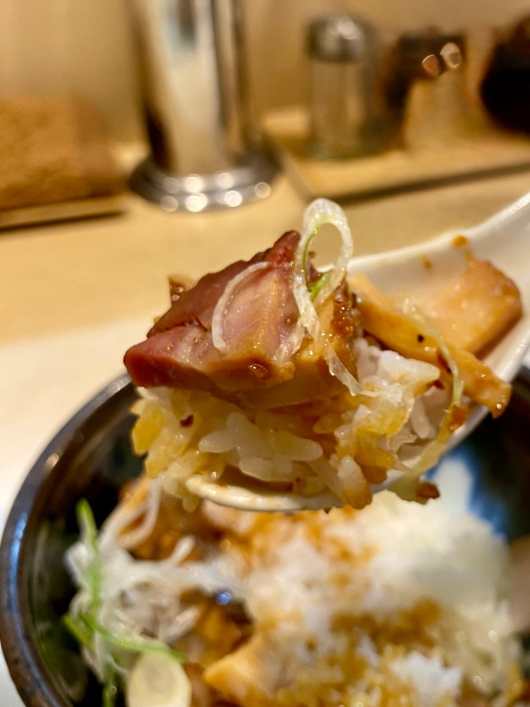 ラーメンのサイドメニューとして注文した「肉飯」もまた絶品だった。ラーメンと同じく、角切りのチャーシューや細切れになったチャーシューがご飯の上にたっぷりと乗せられている。数種類のチャーシューの旨味が一度に味わえ、添えられたネギとタレがご飯によく絡む。ラーメンのスープを少し加えておじや風にしても楽しめる、満足度の高い一品だ。