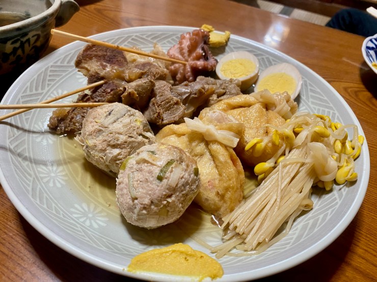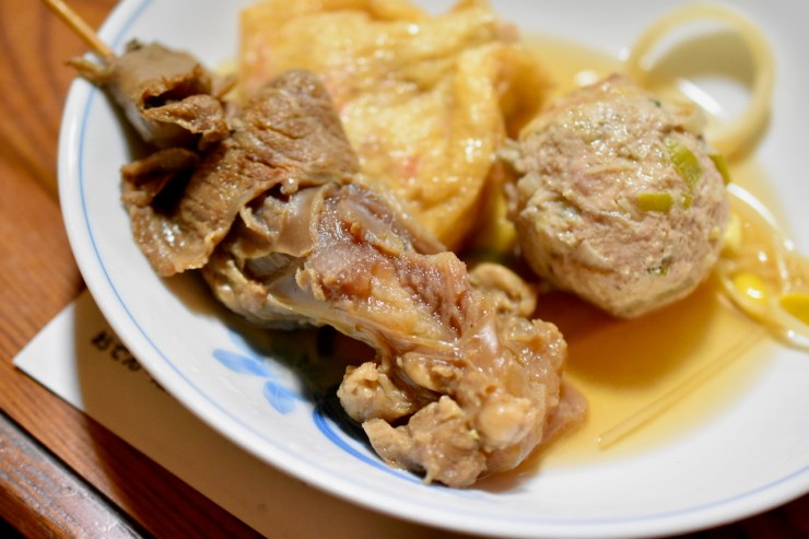 宮崎牛を使った「宮崎牛すじ」や細長い大豆もやし「おやし」が都城らしい。紅生姜の巾着・ゴボウとの鶏の生つくねもオーダー。