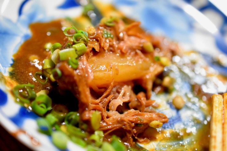 肉の部分は箸でスッとほぐれる柔らかさ、軟骨の部分は適度な硬さとコラーゲンを口いっぱいに感じる。