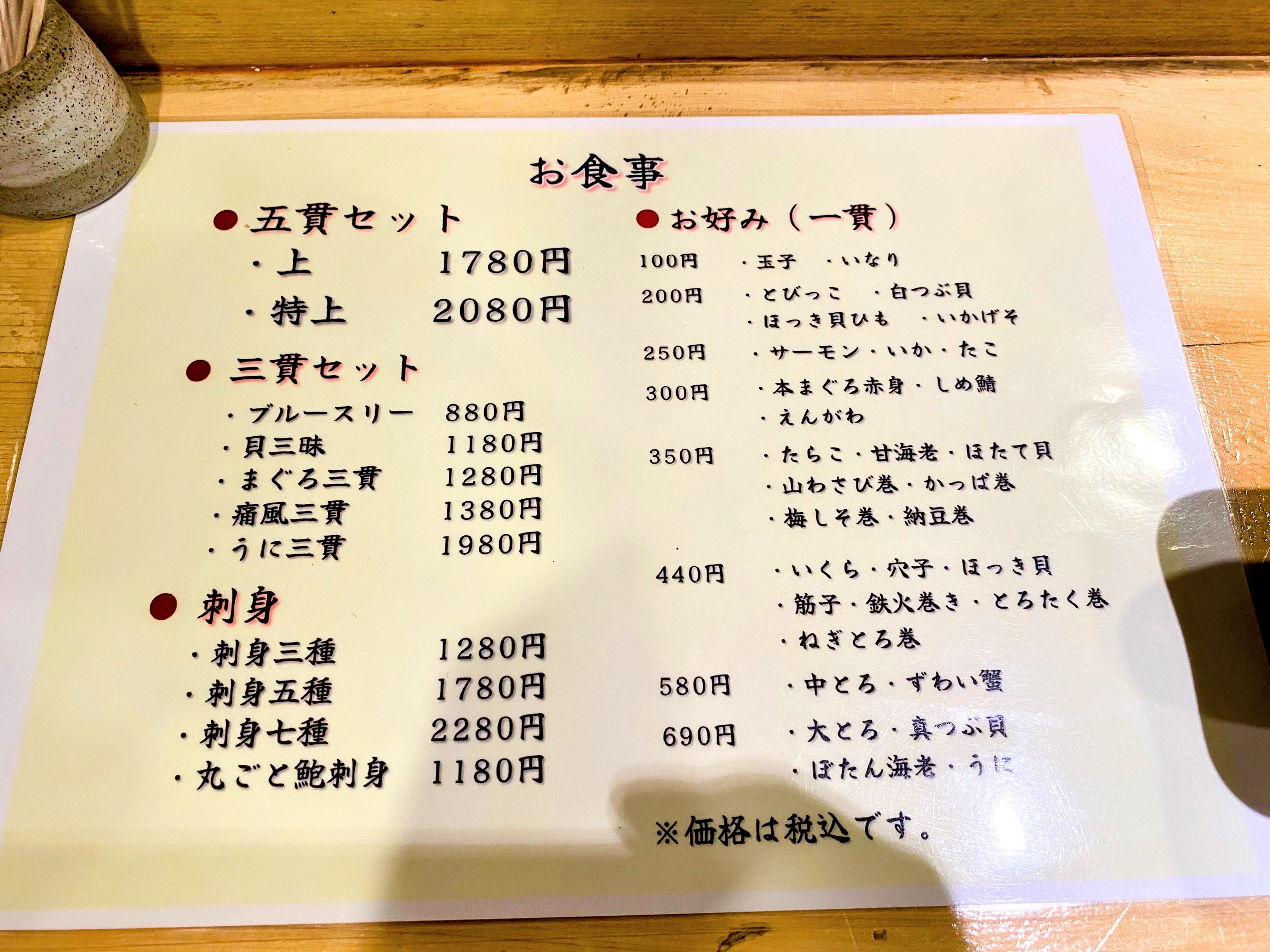 - お好み (一貫): 100円から690円まで。日替わりネタもあり。
