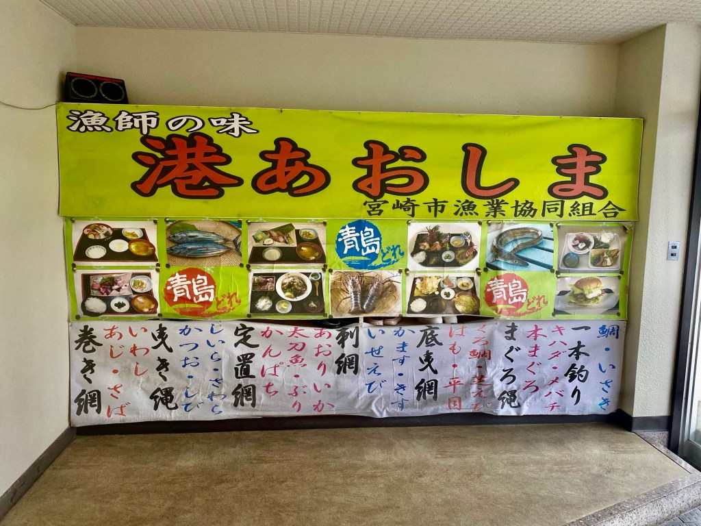 窓からは漁港と、その先に観光地青島の景観が見える。壁には大漁旗や有名人のサイン色紙が飾られ、漁港直営の食堂らしい賑わいがある。