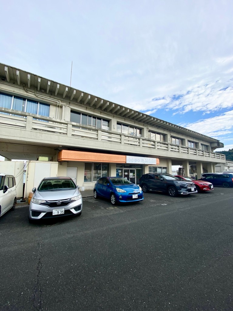 青島漁港に建つ漁協の建物を再利用した店舗外観。車でのアクセスを前提とした広大な駐車スペースが目の前にある。