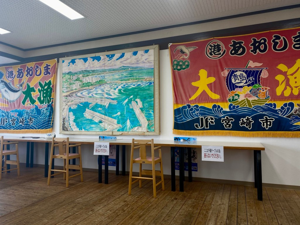 「港あおしま 大漁」の文字が入った大漁旗。長テーブルと椅子が並び、大人数に対応できる元会議室らしいレイアウト。