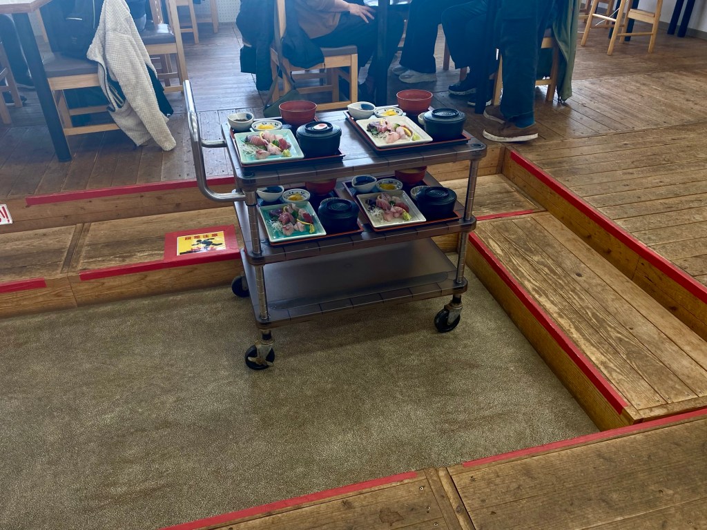 料理を運ぶ配膳ワゴン。元会議室らしい広々とした空間に、低いフロアと木製の段上げ造作がある独特な店内の構造がわかる。