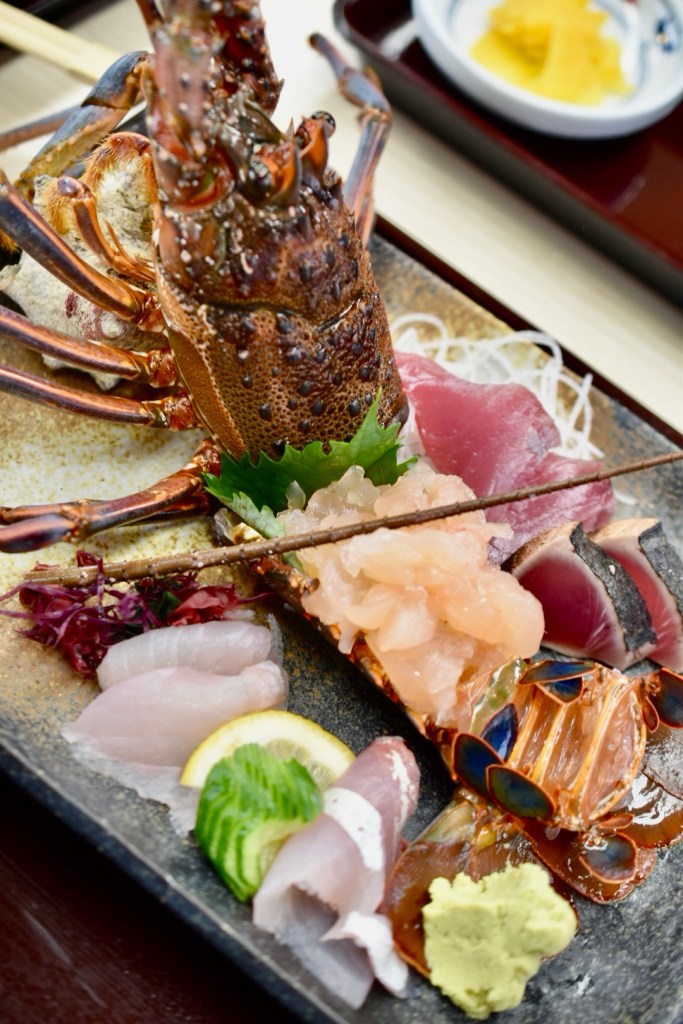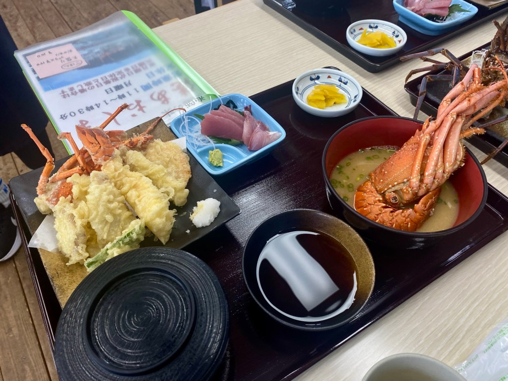活きの良い伊勢海老の刺身に、4種の刺身、伊勢海老の味噌汁、伊勢海老の頭焼きなどがついた定食。