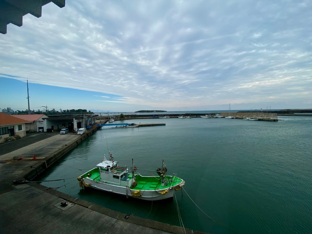 店内窓から見える青島漁港の景色。漁船が係留されており、新鮮な魚介が水揚げされる場所であることを実感できる。
