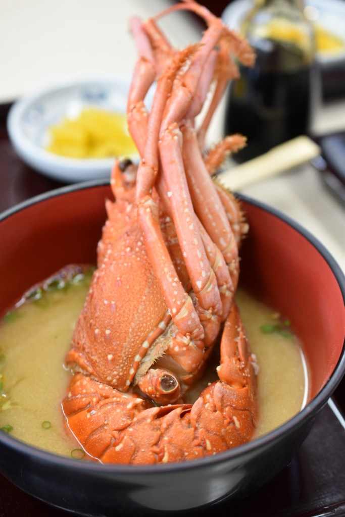 伊勢海老の半身が丸ごと入った味噌汁。甲殻類の強烈な旨味が溶け出し、定食の味を深めている。