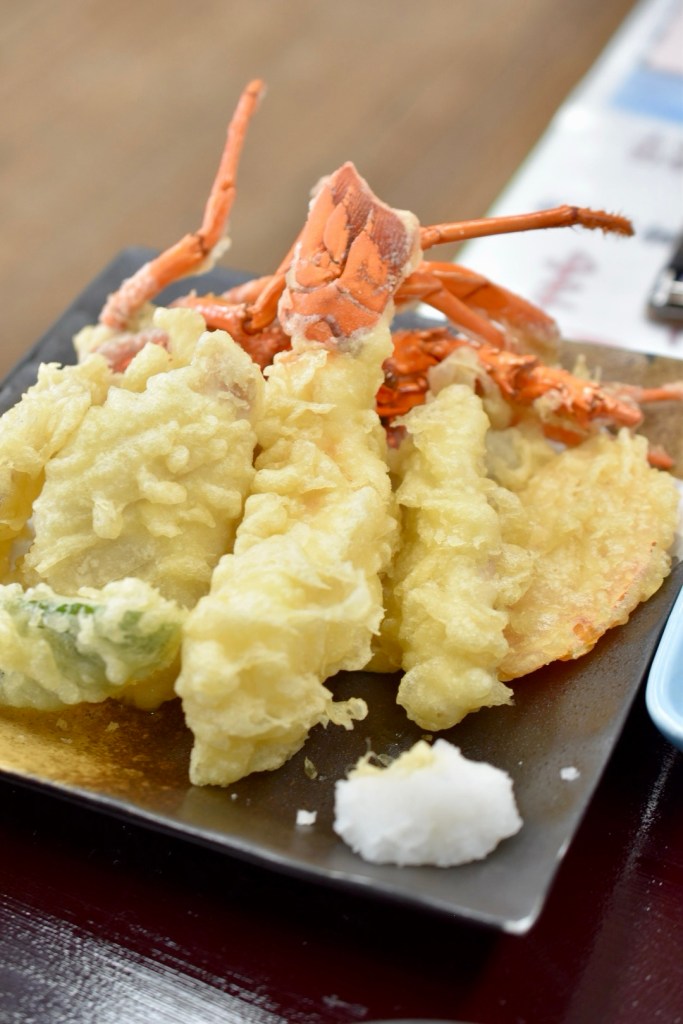 注文した定食のメインである伊勢海老の天ぷら。衣はサクサク、身はブリブリの食感。
